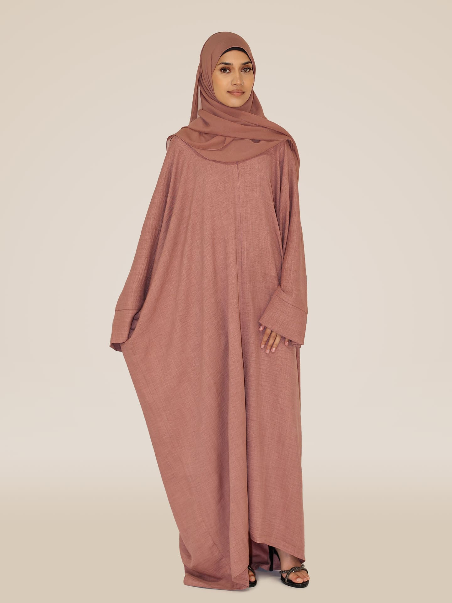 Step into timeless sophistication with our blush pink batwing closed abaya, crafted from high-quality milan linen for a soft, luxurious feel. This abaya features elegant batwing sleeves, creating a flattering, flowy silhouette that complements any body type. The gentle blush pink adds a feminine touch, making it ideal for special events and casual outings. Designed with a closed front for added modesty, this piece brings together comfort and style effortlessly, perfect for a refined, everyday look.