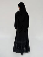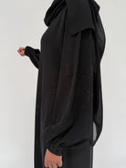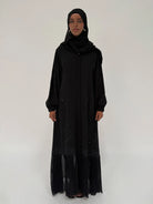 The Aseel Abaya Set features a sleek black design with intricate embellishments and pleated detailing at the hem. This 2-piece set includes a stylish abaya and a coordinating hijab, perfect for both formal and casual occasions. The soft fabric and detailed design offer a balance of comfort and elegance.