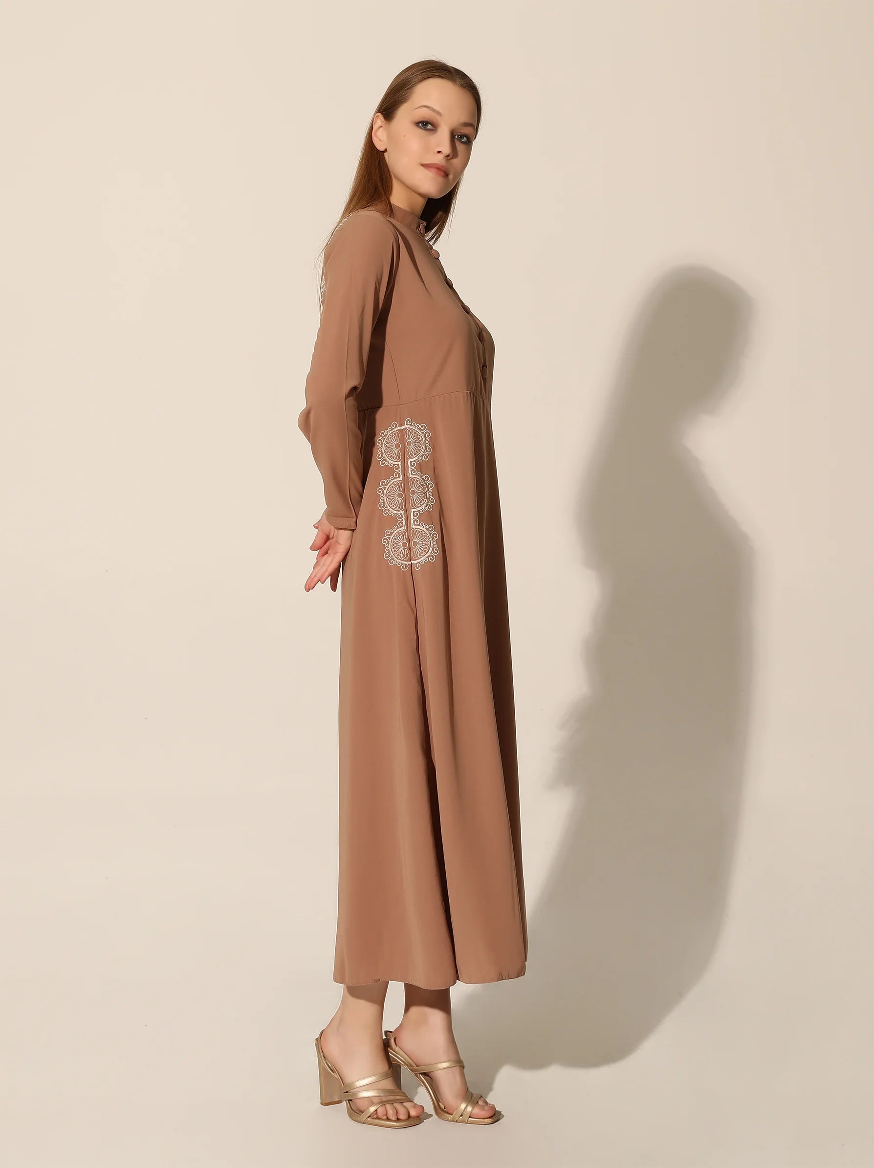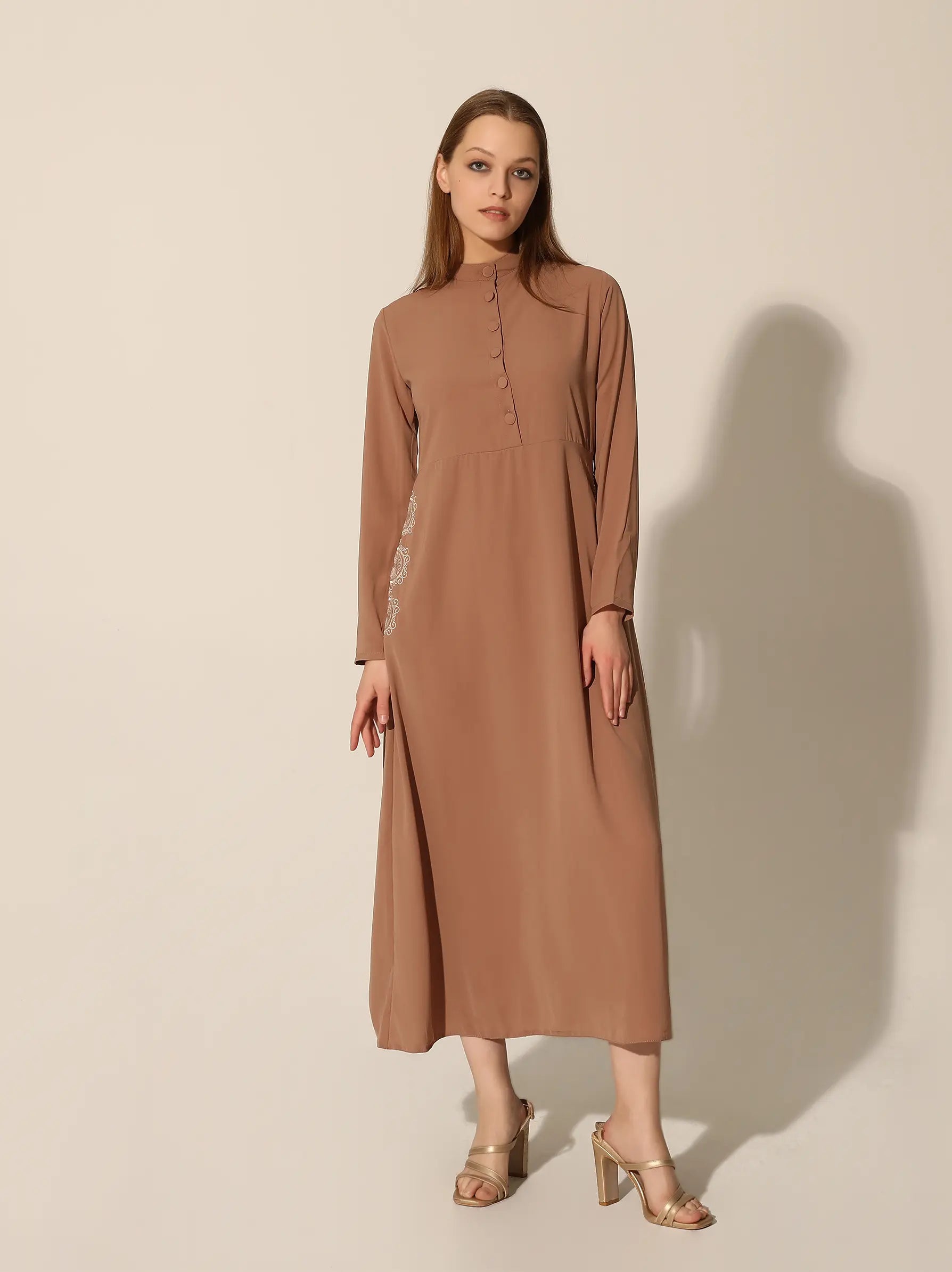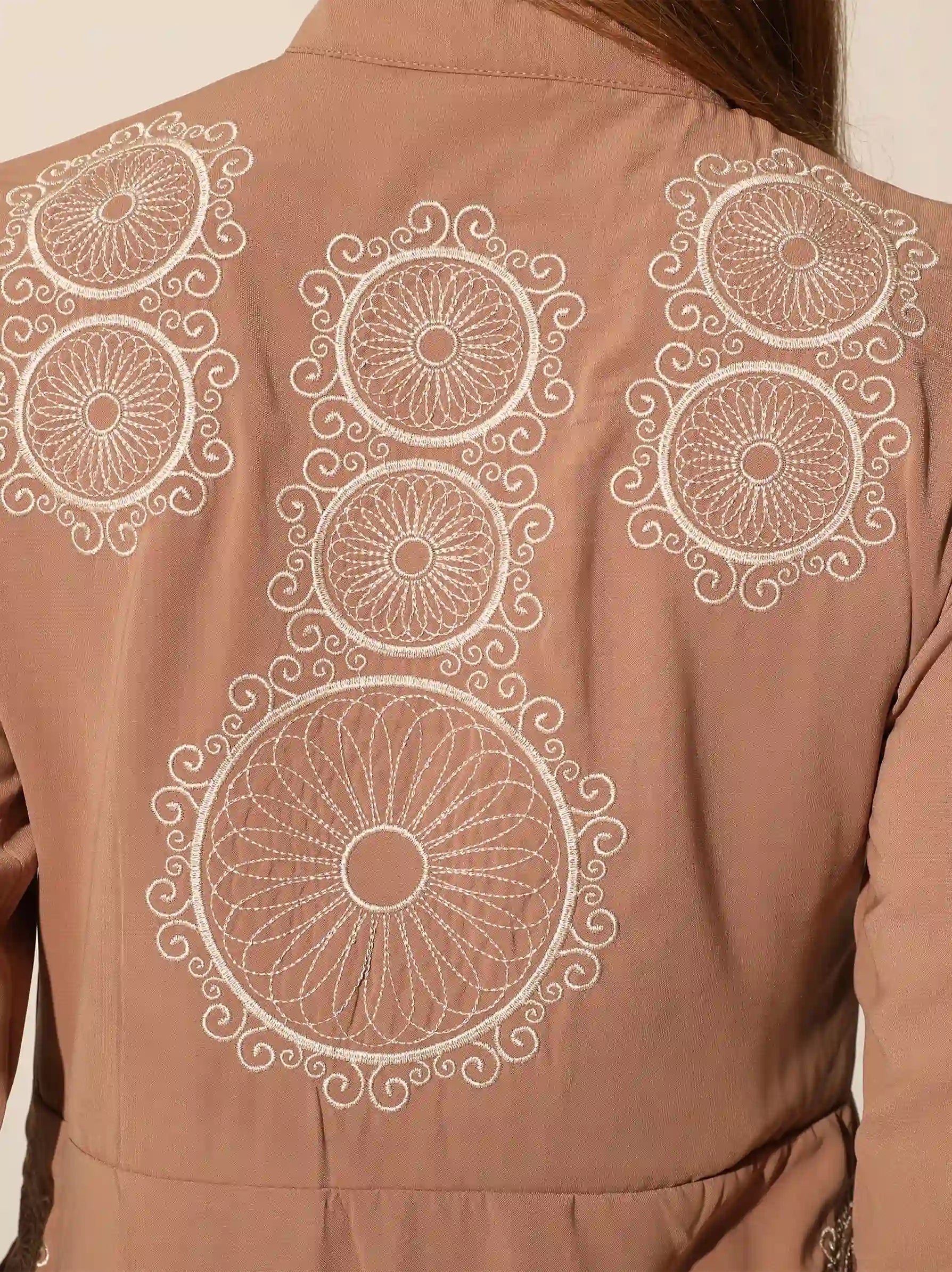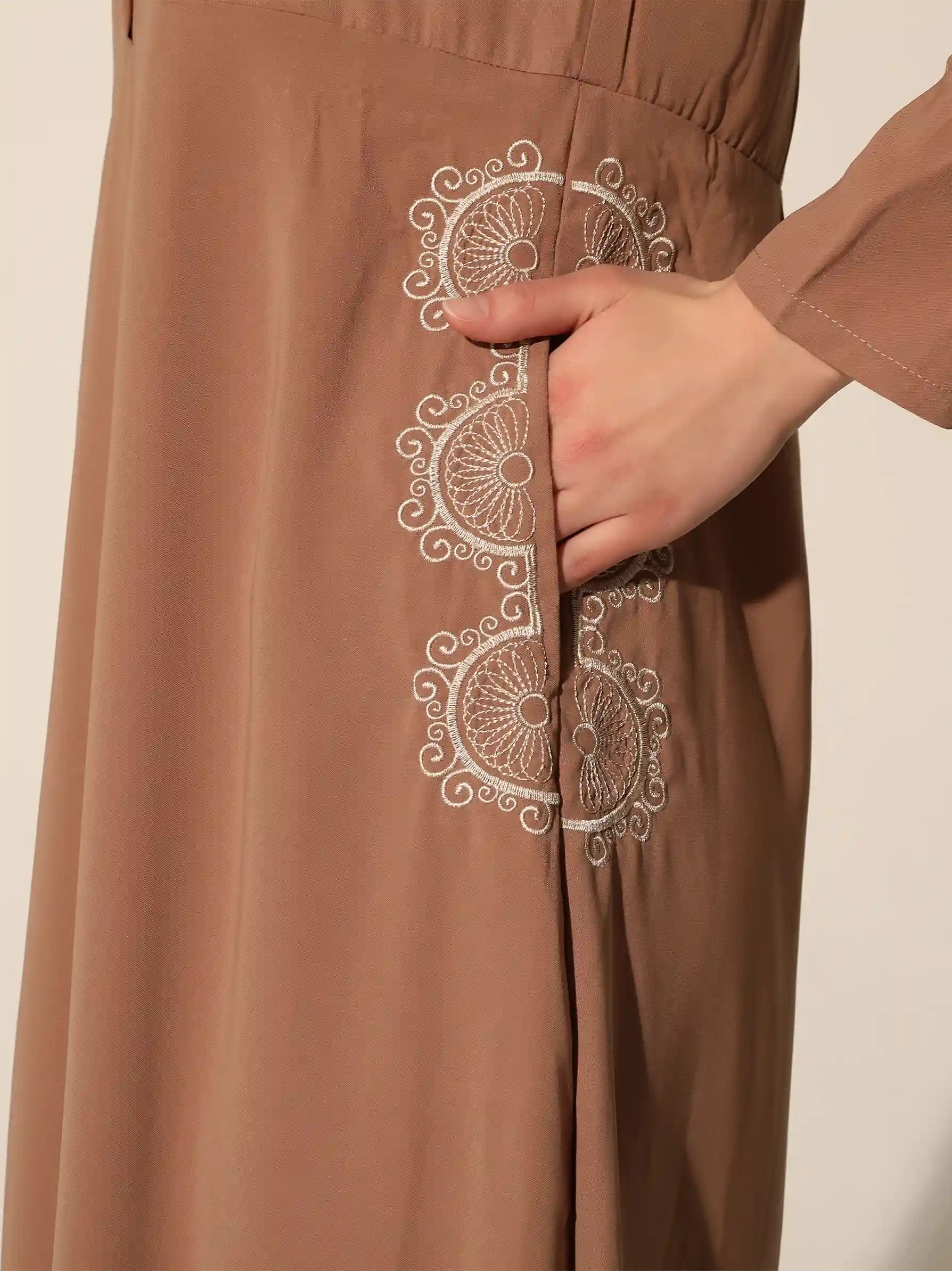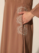 Our embroidered brown maxi dress features a warm brown tone, beautifully adorned, intricate embroidery on the back and around side pockets, finished using shiny threads giving a light shimmer