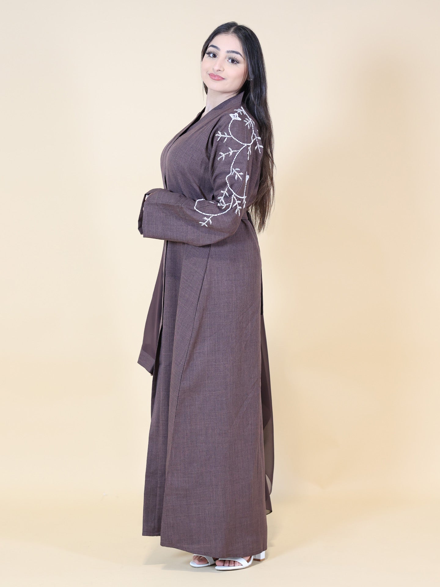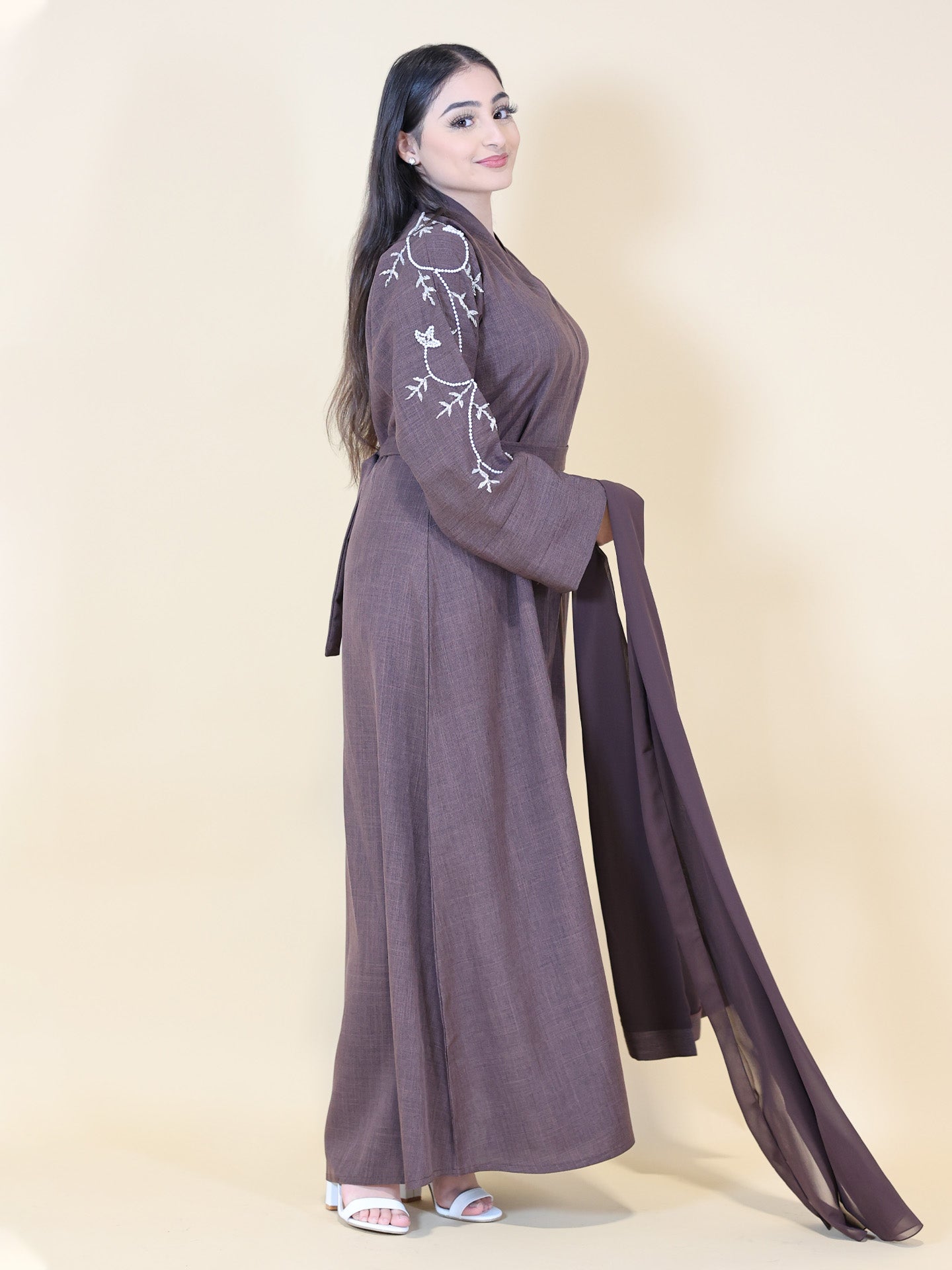 Elevate your style with our chocolate brown pearl embellished 2-piece abaya set, crafted from premium linen fabric for a lightweight, breathable, and natural feel. This elegant abaya features delicate pearl embellishments on the arms and shoulders, adding a touch of sophistication to its timeless design. Complete with a matching hijab and a belt, this set offers versatility and grace for any occasion.