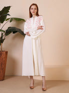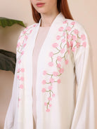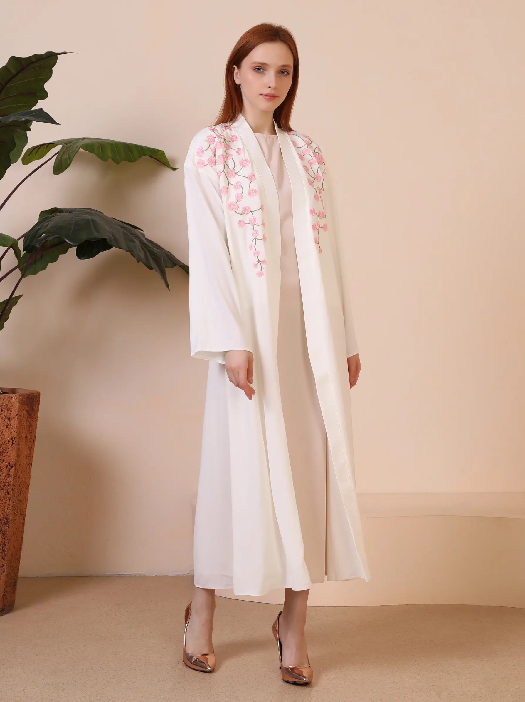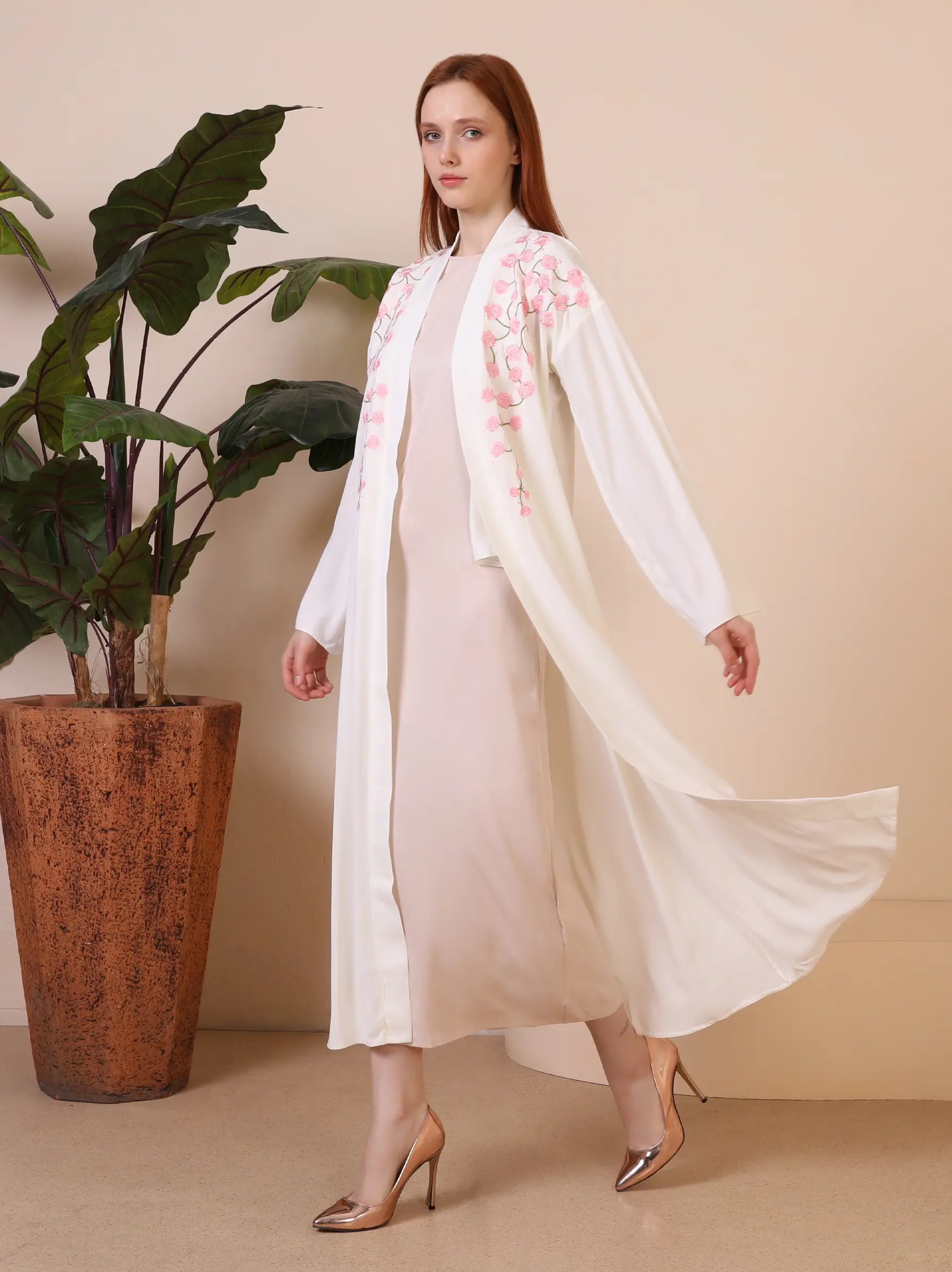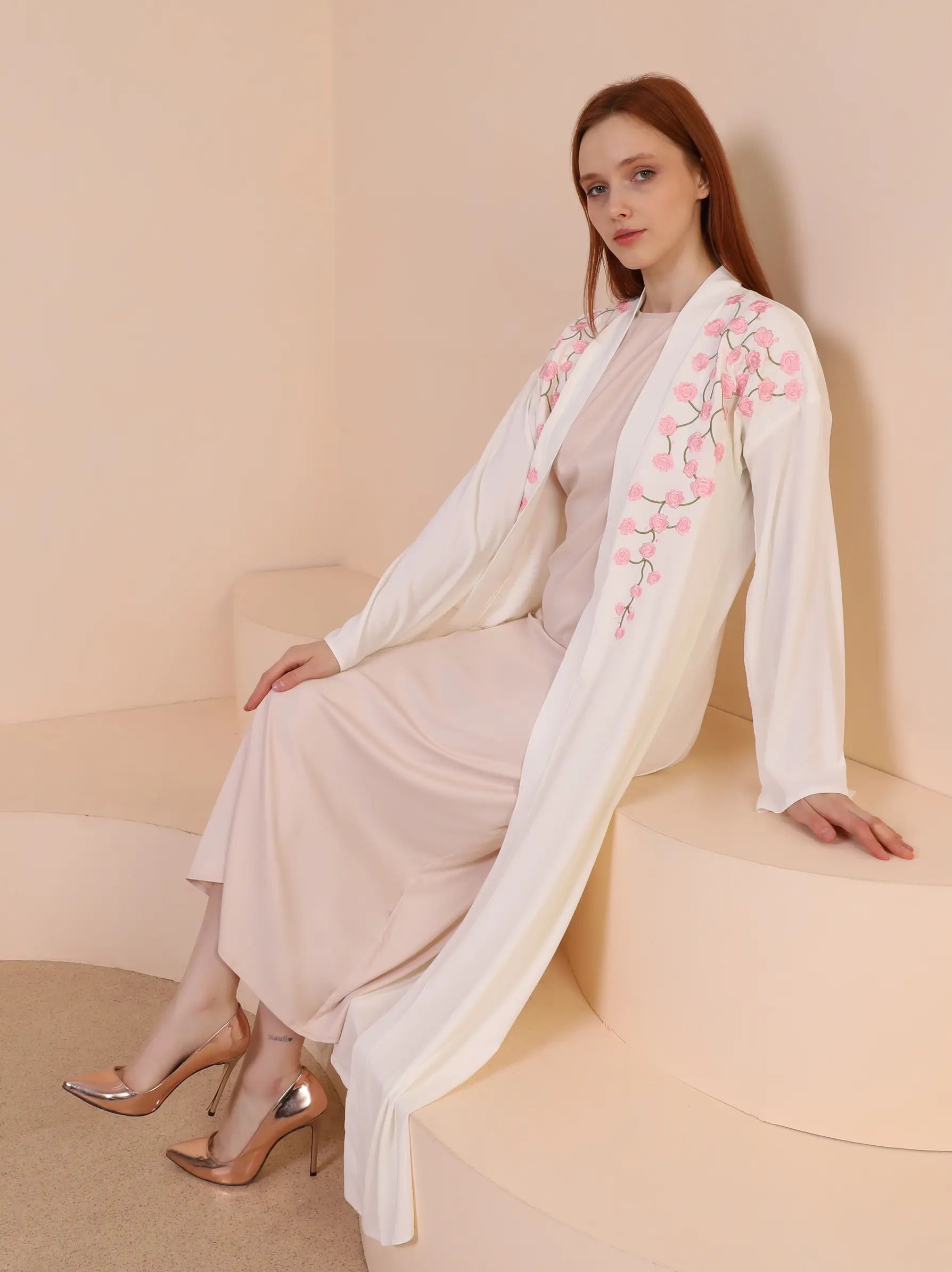 Embodying classic style and modern elegance, our cream floral embroidered kimono is the perfect accompaniment to any luxury outfit. Features enhanced with embroidery on the front panels, wide sleeves and neutral-shaded fabric with soft pink embroidery. A timeless classic floral kimono, completed with a perfect length to elegantly fall on ankles. Pair it up with our lovely selection of heels.