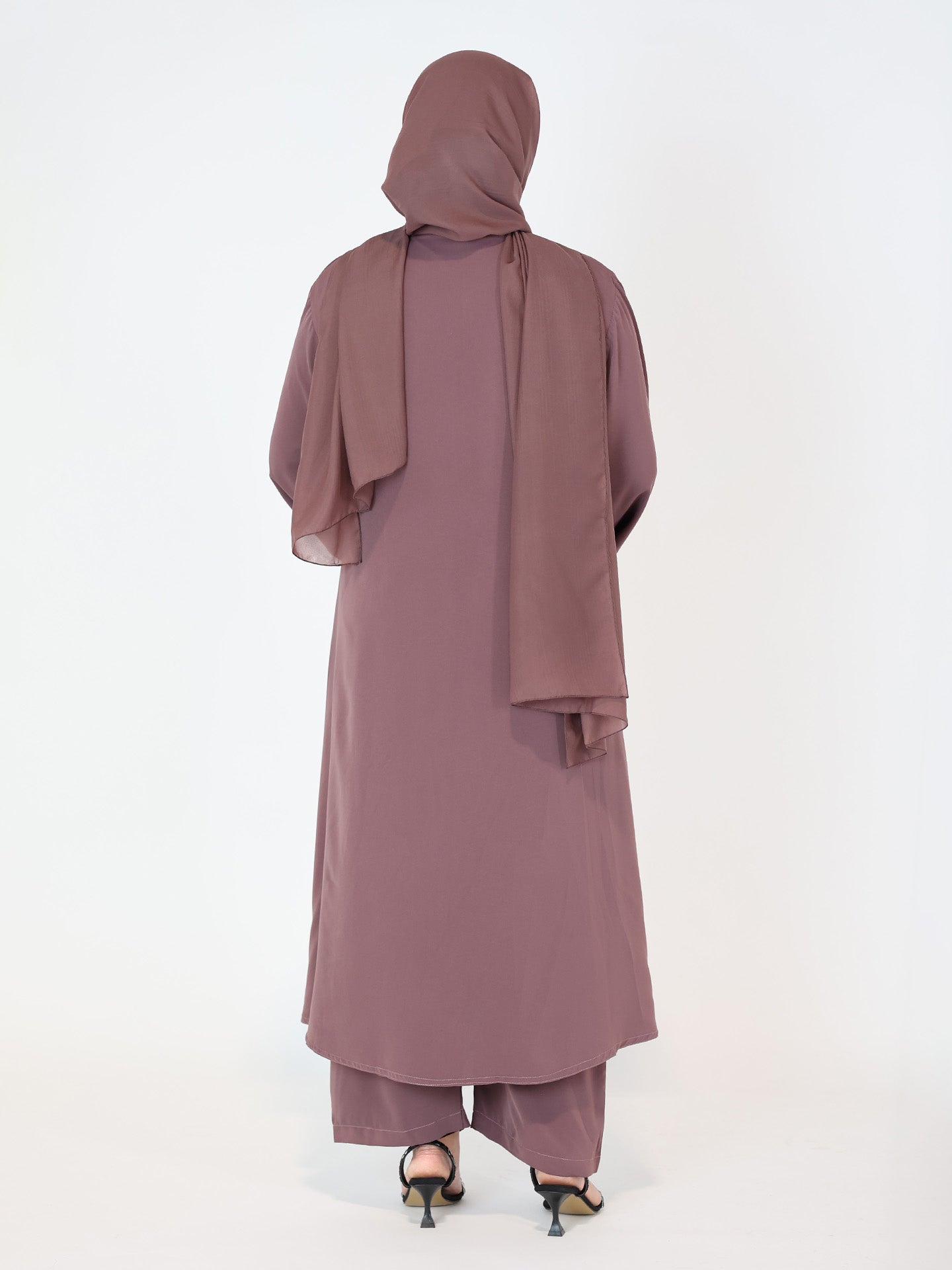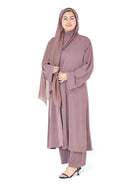 Presenting some serious style points with a dusty rose pink 4-piece co-ord set. An effortlessly stylish outfit, this hijab, slip dress, abaya, and matching trousers can be dressed up or down to suit any occasion. Pair it with a mini bag and some strappy heels for a more fancy look, or complete with kicks for a casual look. Add some color and comfort to your wardrobe with this matching three-piece set. We’ve got the year-round trendy look for you.