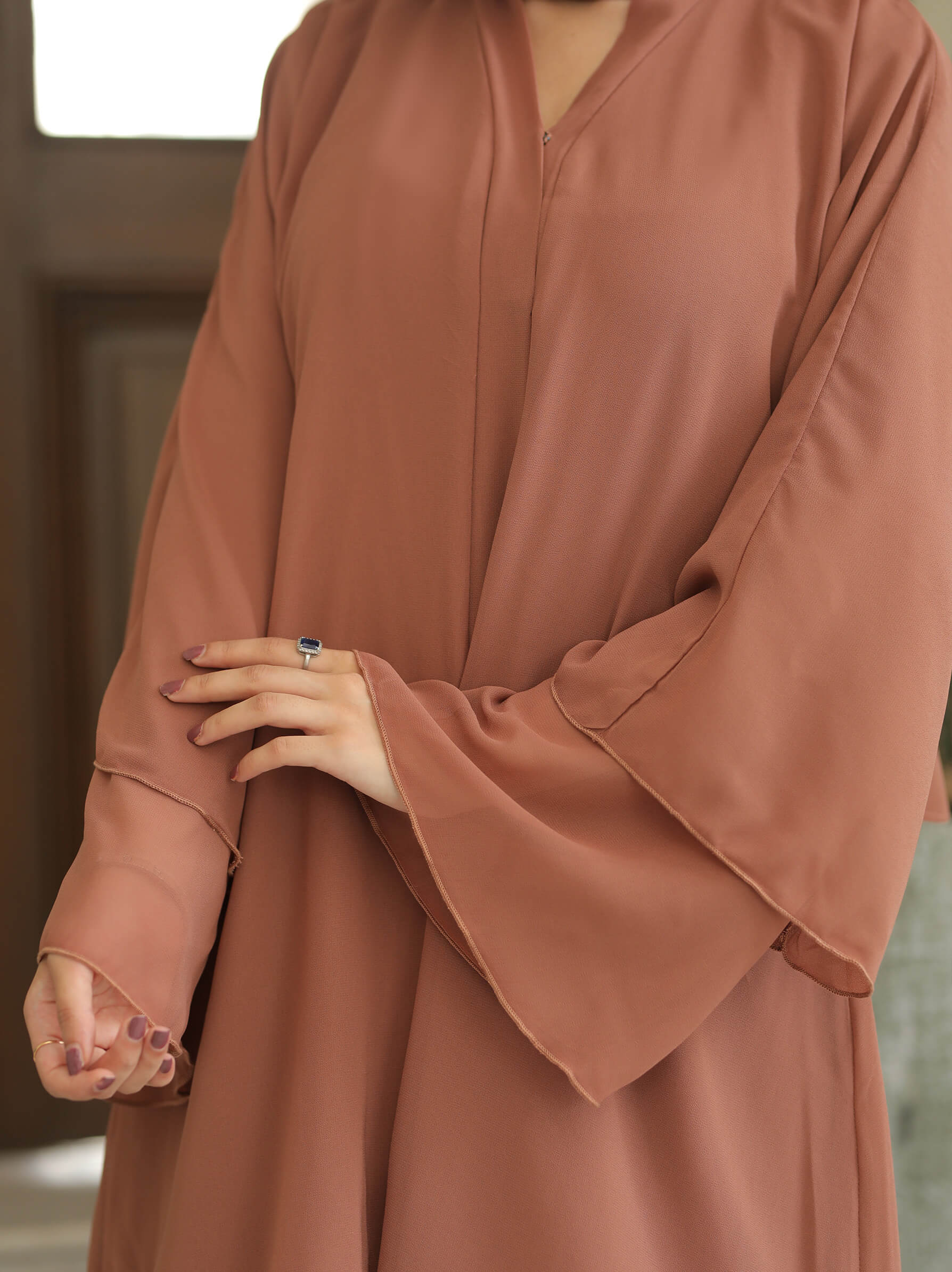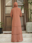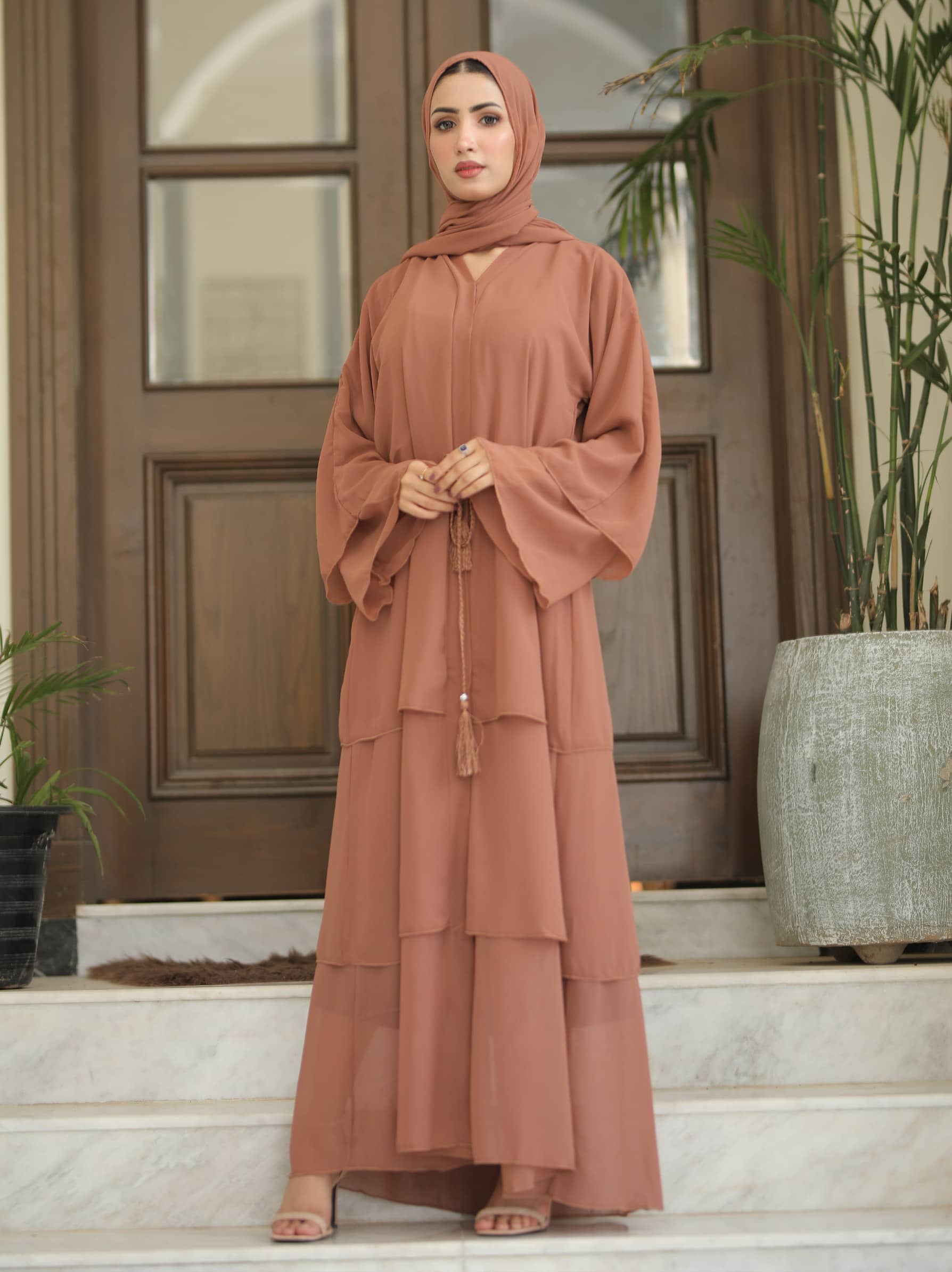 Elevate your modest fashion with our Layered Brown Chiffon Closed Abaya Set. Crafted with a luxurious blend of chiffon and 90% polyester, this abaya offers a perfect balance of style and comfort. The soft, flowing layers of chiffon create a graceful silhouette, providing a sophisticated look for any occasion.  The lightweight fabric ensures you stay cool and comfortable, even on warmer days, while maintaining modest coverage. Whether attending a formal event or seeking a chic everyday outfit, this abaya ensures you look effortlessly elegant.