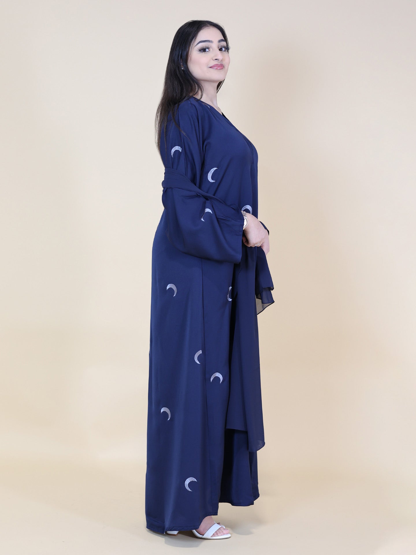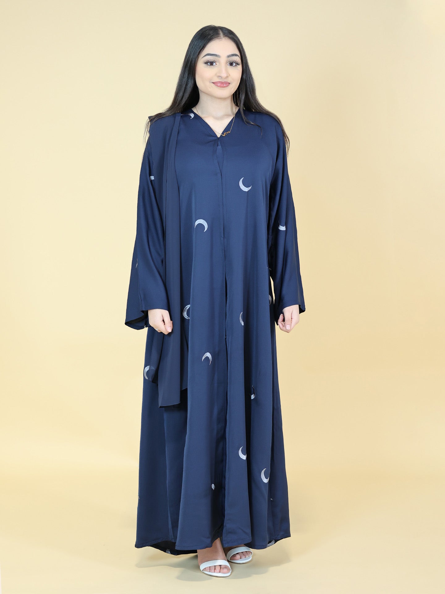 This stunning navy blue moon embroidered 2-piece abaya set, includes a beautifully designed abaya and a matching hijab, making it a perfect choice for modest yet stylish fashion. Crafted in a rich navy blue hue, the abaya features delicate moon-inspired embroidery that adds a celestial charm to your look. The matching hijab completes the outfit effortlessly, ensuring a polished and cohesive appearance.