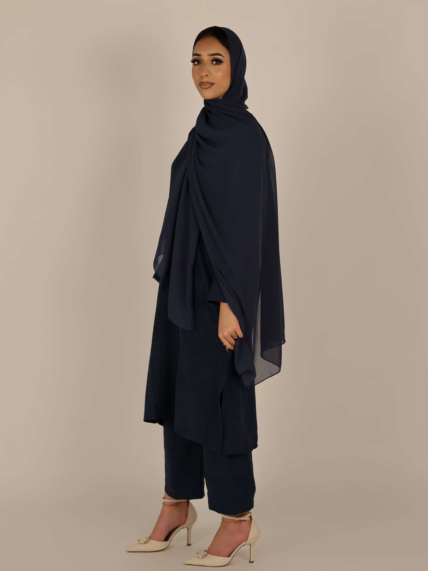 Presenting some serious style points with this shirt and trouser navy blue round neck dress co-ord set. An easy outfit to throw together, these carrot trousers and matching shirt can be dressed up or down. Pair it with a mini bag and some strappy heels for a more fancy look, or complete with kicks for a casual look. Add some colour and comfort to your wardrobe with this matching two-piece set. We’ve got the year-round trendy look for you.