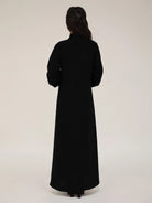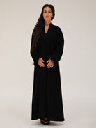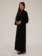 Step into elegance with the Samaa - 2 Piece Feather Sleeve Abaya, crafted from premium Koobra fabric. This black abaya features chic feather-detailed sleeves for a touch of sophistication. Complete with a matching scarf, it effortlessly blends modesty with modern style.