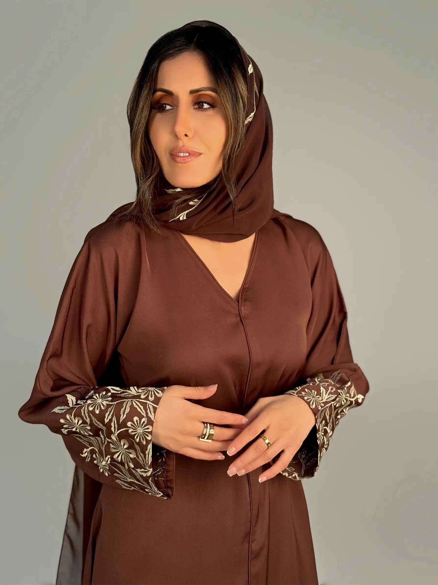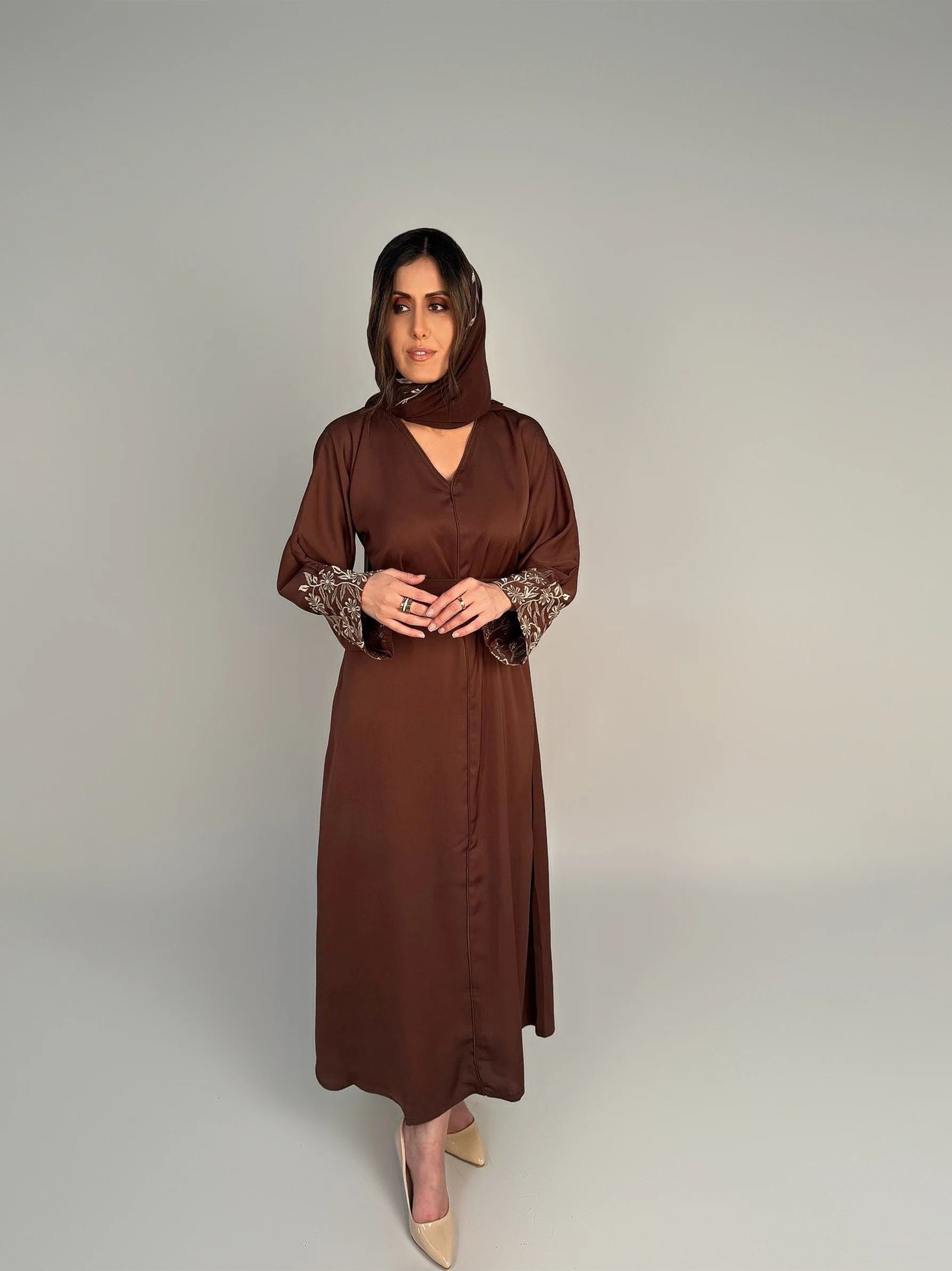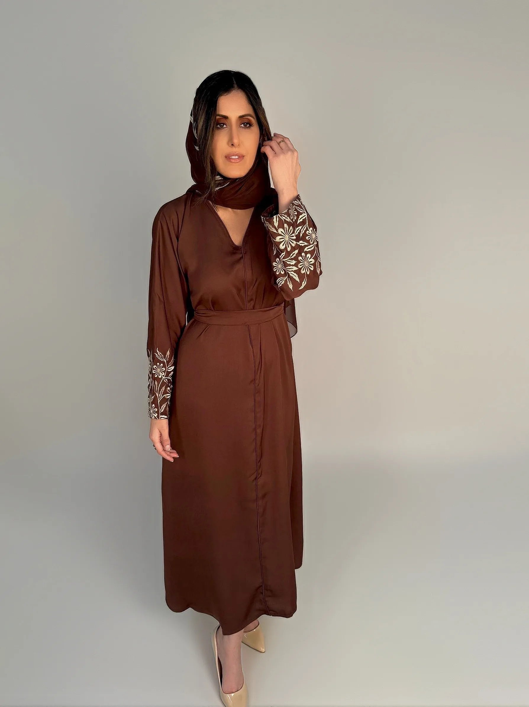 Dark Brown Embroidered 2 Piece Abaya Set