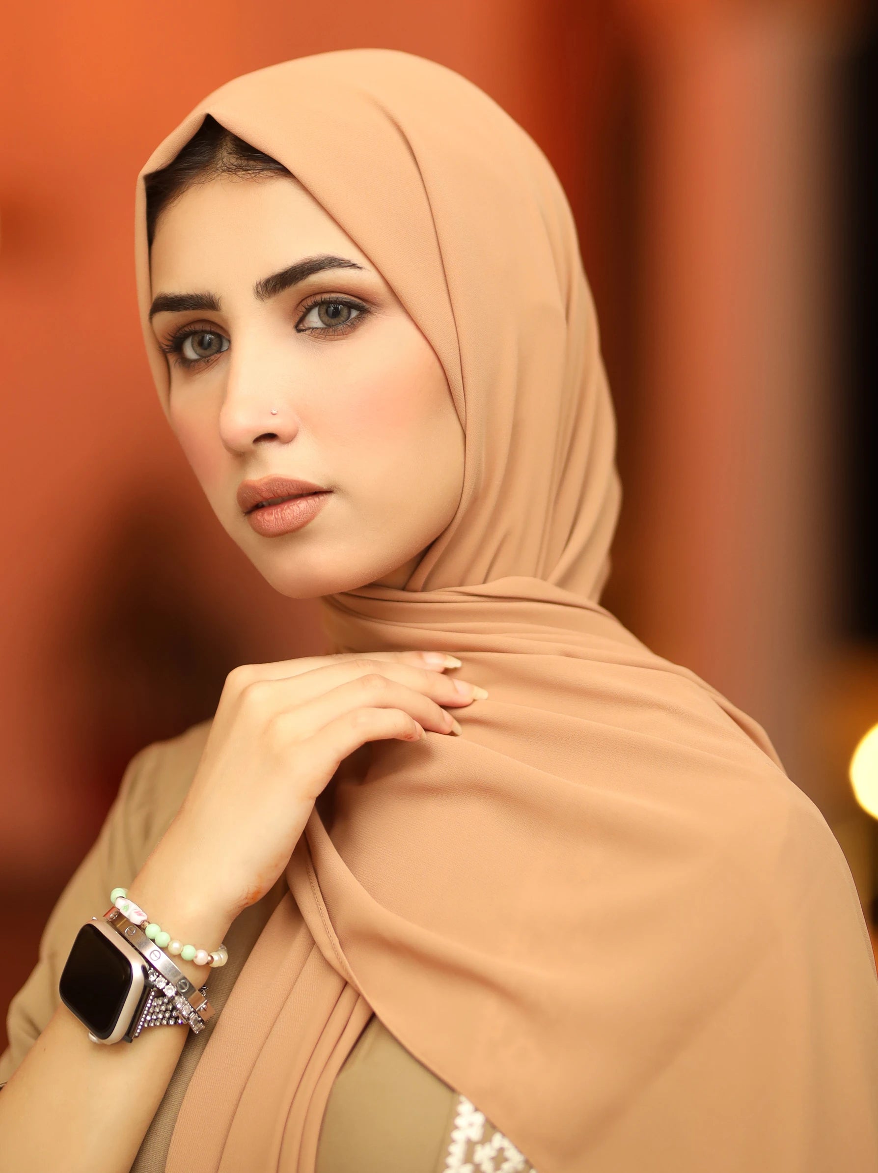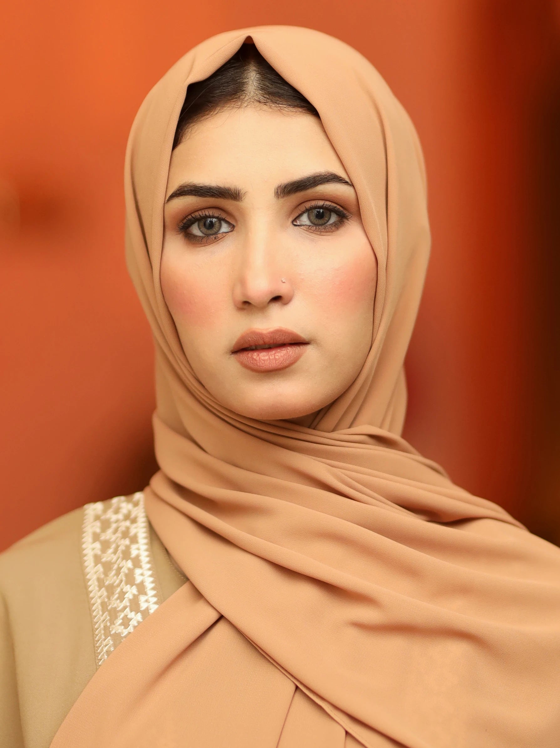 This opaque light brown chiffon chiffon scarf is perfect for keeping your head and neck warm during cooler days. It is made of a chiffon fabric, and is lightly opaque for extra coverage. The delicate material is lightweight, making it easy to style in a variety of ways. It is finished with an all-around hem for a clean, sophisticated look. Whether you’re styling your look for a special occasion or just for everyday wear, this light brown chiffon hijab will add a touch of grace and warmth to your outfit.