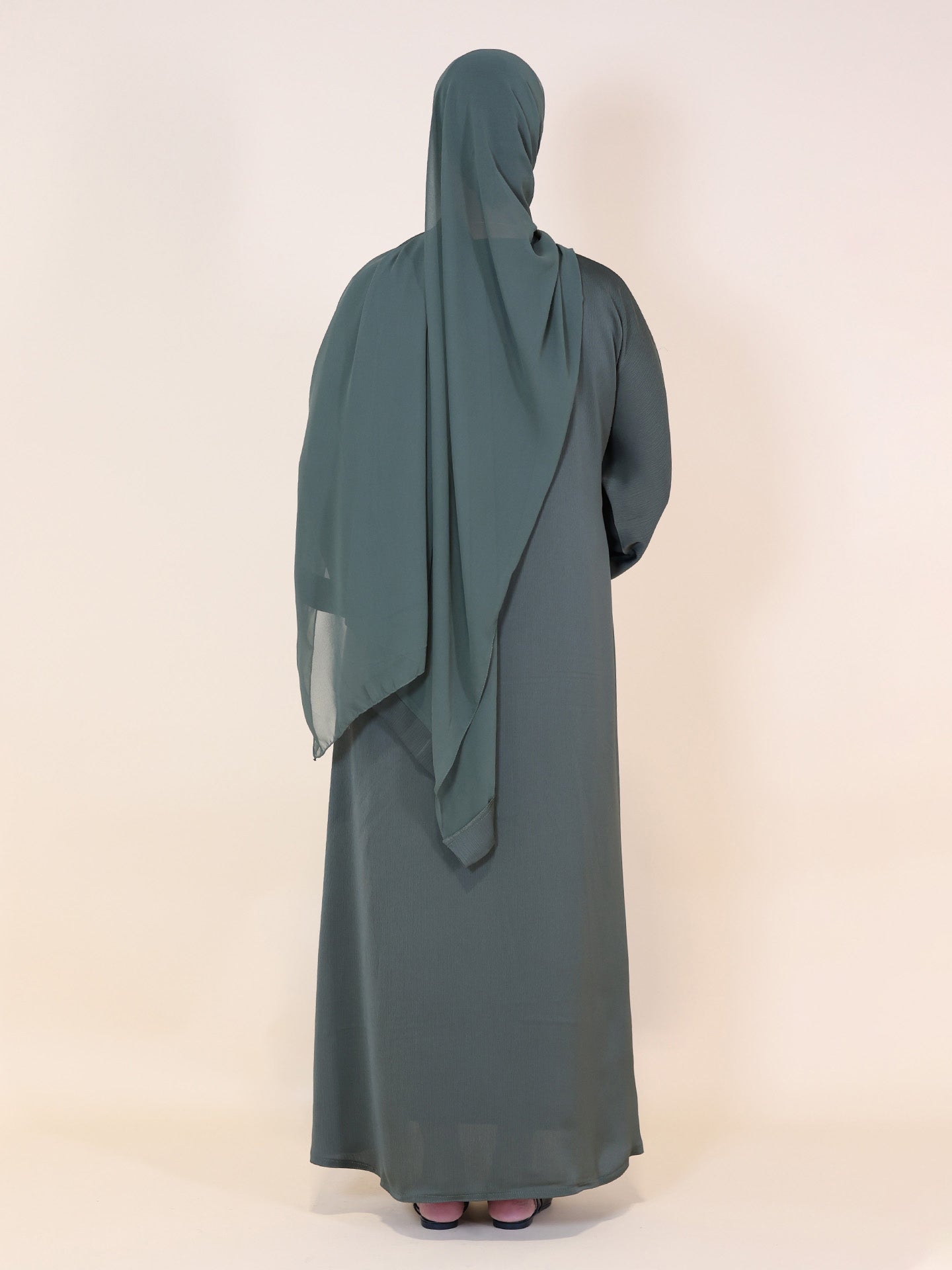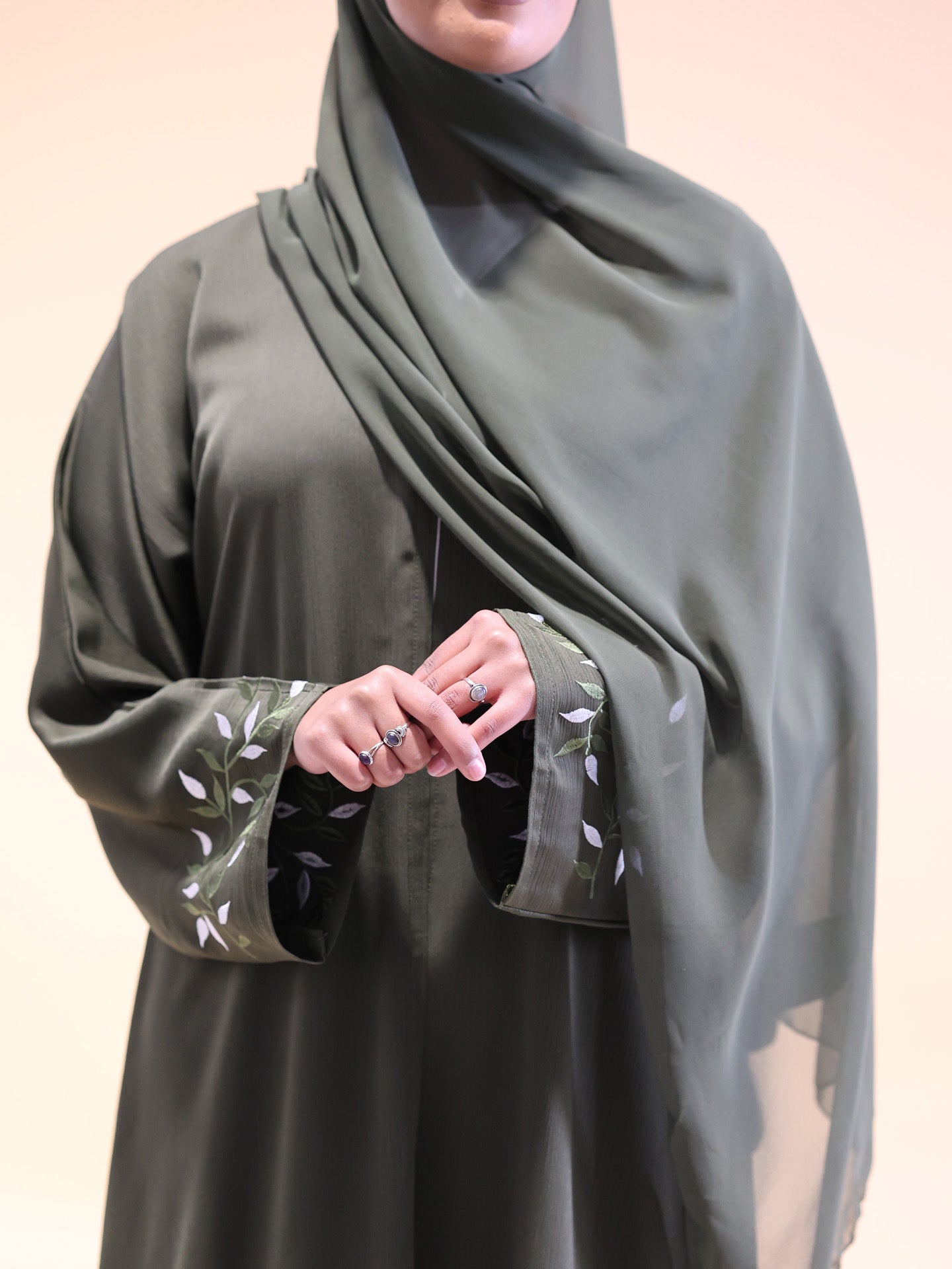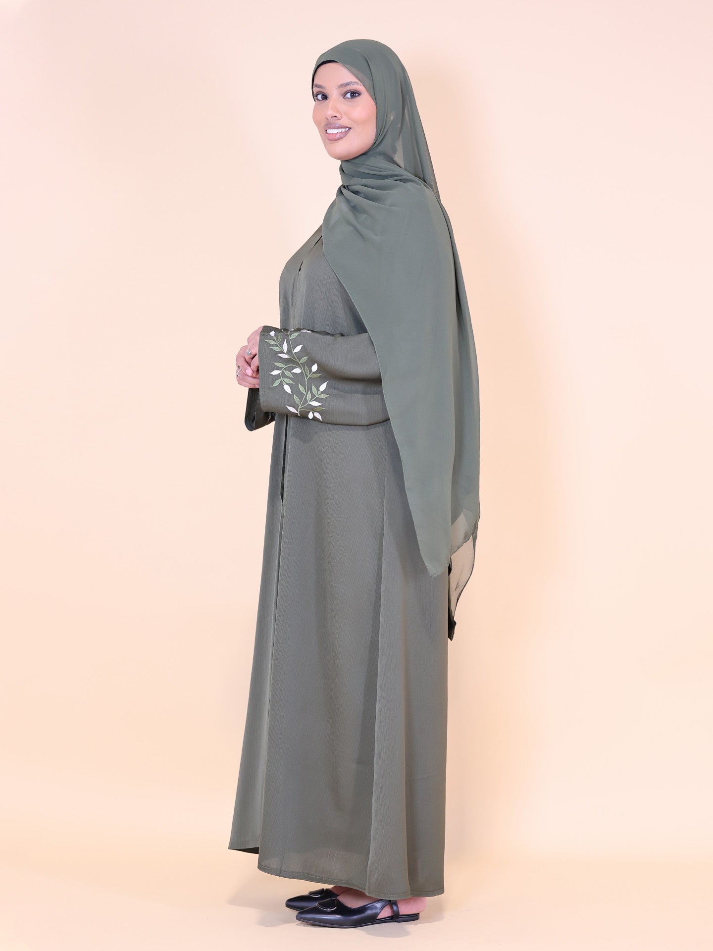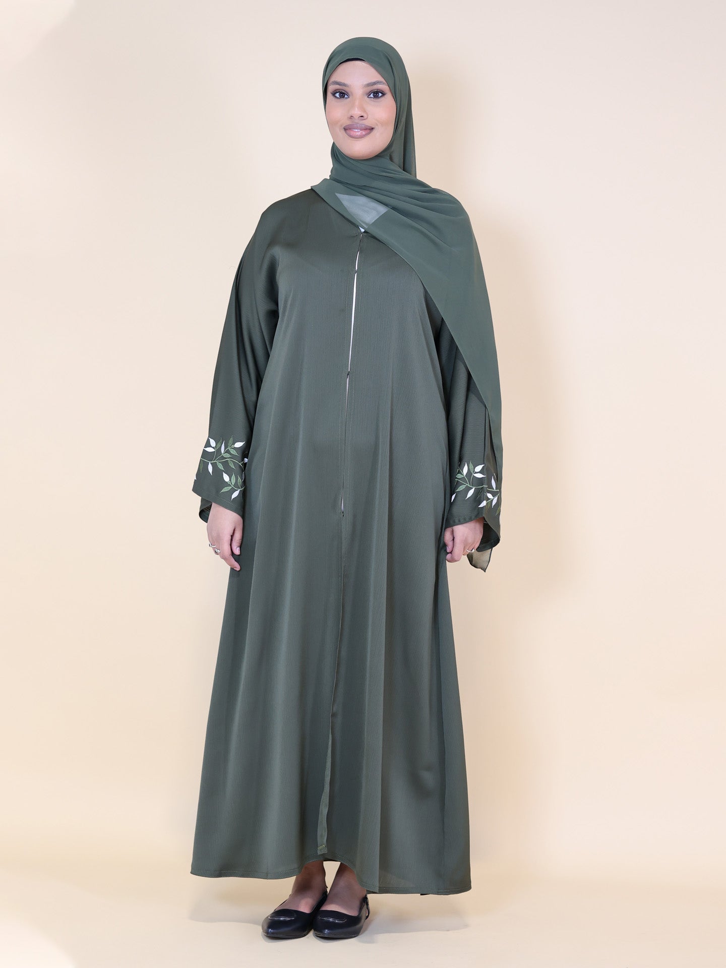 Experience timeless elegance with our olive green abaya, designed for the modern woman seeking comfort and style. This two-piece set features delicate embroidery on the sleeves, adding a subtle touch of sophistication to the flowing silhouette. Crafted from a breathable, lightweight fabric, it offers all-day ease, making it perfect for casual and formal outings. Complete with a matching hijab; this olive green abaya ensures a coordinated, polished look that seamlessly blends understated charm with contemporary flair.