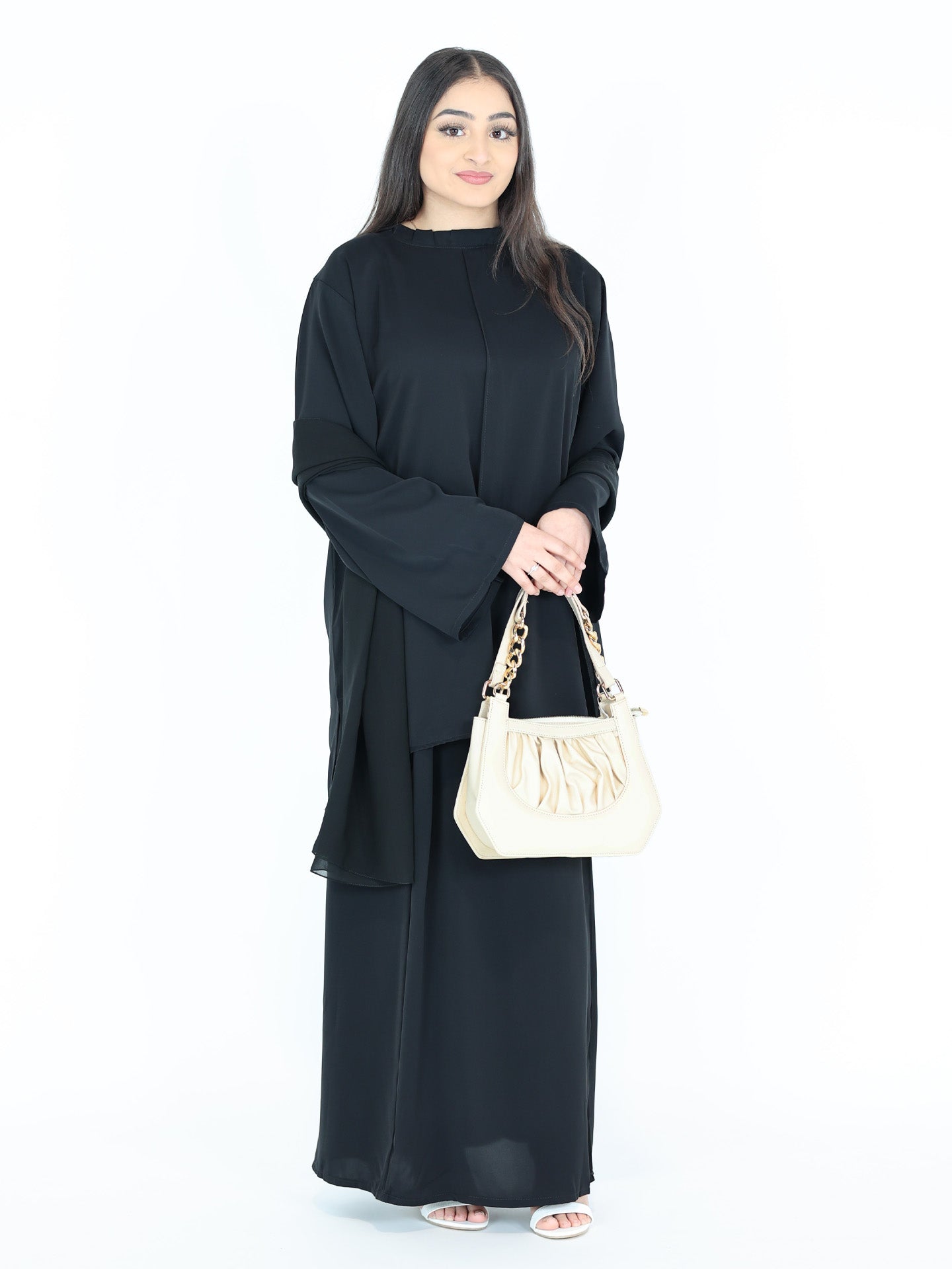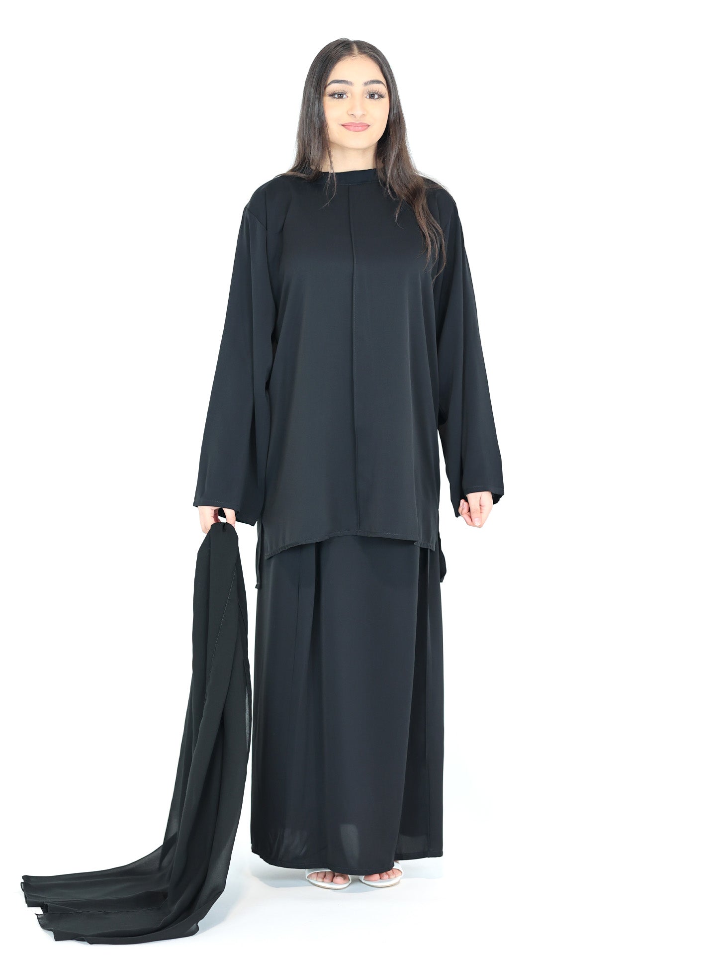Presenting some serious style points with this black top, hijab and skirt 3-piece co-ord set. An easy outfit to throw together, this skirt, hijab and matching top can be dressed up or down to suit any occasion. Pair it with a mini bag and some strappy heels for a more fancy look, or complete with kicks for a casual look. Add some color and comfort to your wardrobe with this matching three-piece set. We’ve got the year-round trendy look for you.