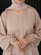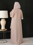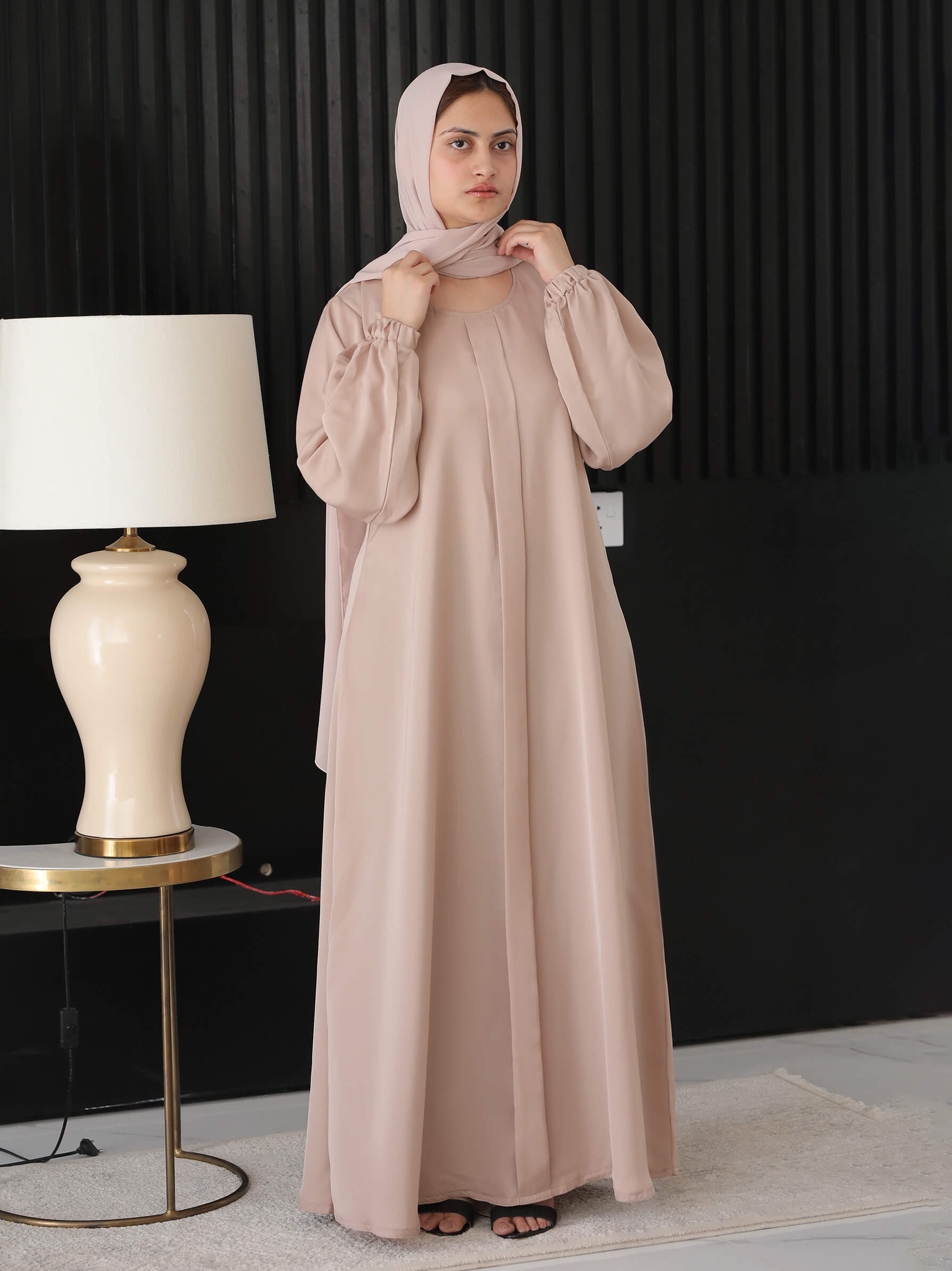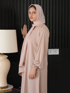 Step into a world of refined elegance with our Beige Balloon Sleeves 2 Piece Abaya. The gentle beige tone radiates warmth and sophistication, while the unique balloon sleeves add a contemporary twist to this classic design. Perfectly tailored for the modern woman. This abaya is made from high-quality Nada fabric that is lightweight, breathable, and soft to the touch. The 80% polyester blend ensures that the abaya drapes beautifully while maintaining its shape, making it ideal for both everyday wear and special occasions.