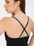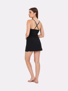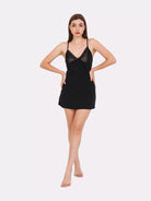 Black mid-thigh, fitted through chemise with adjustable straps that cross over at the back for a perfect fit. The perfect nightwear dress that is kind to the skin with breathable cotton fabric and chic tulle, lace details, comfortable stretchy fabric that delicately wraps around your body.