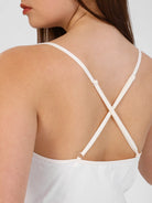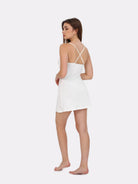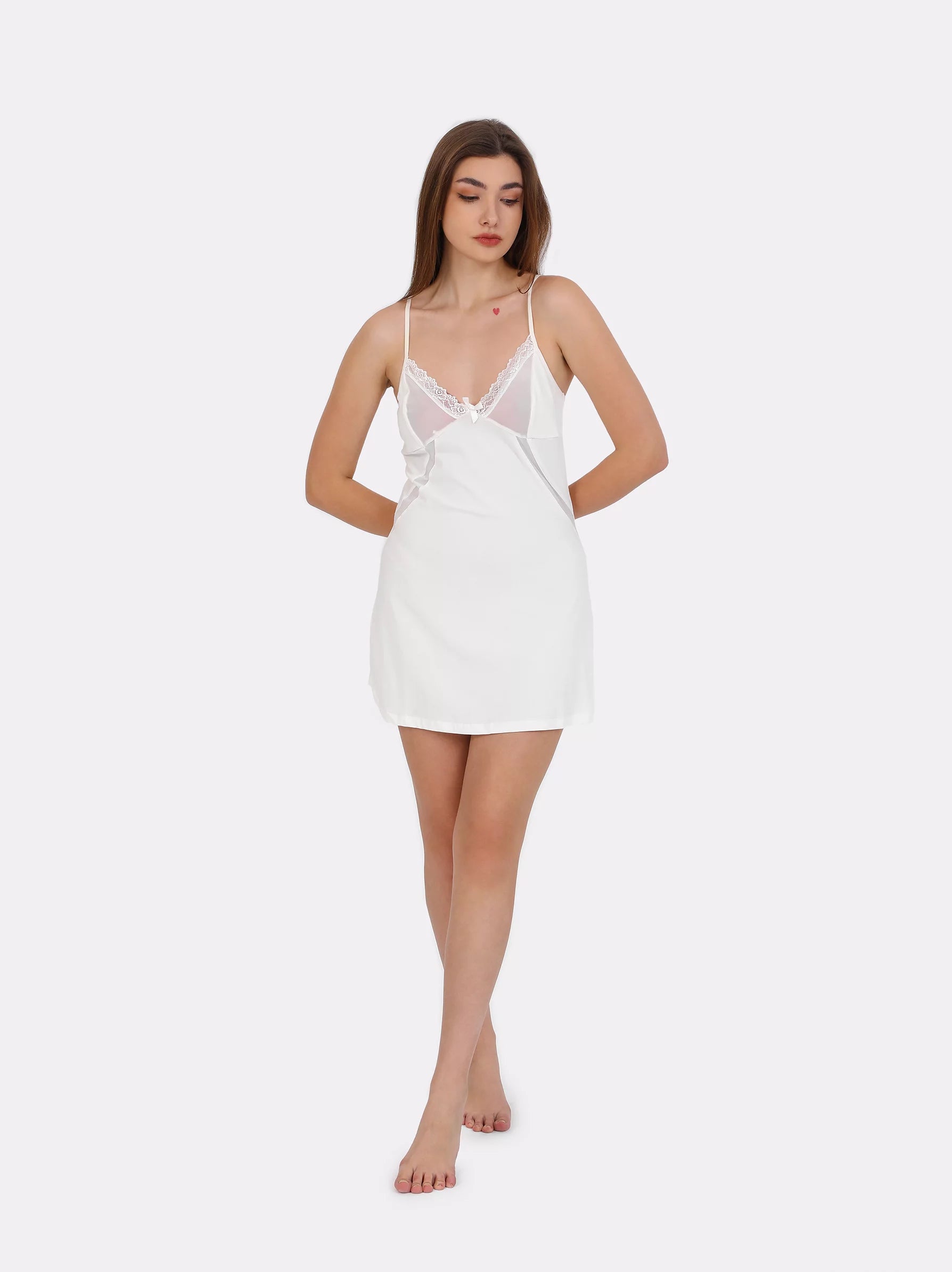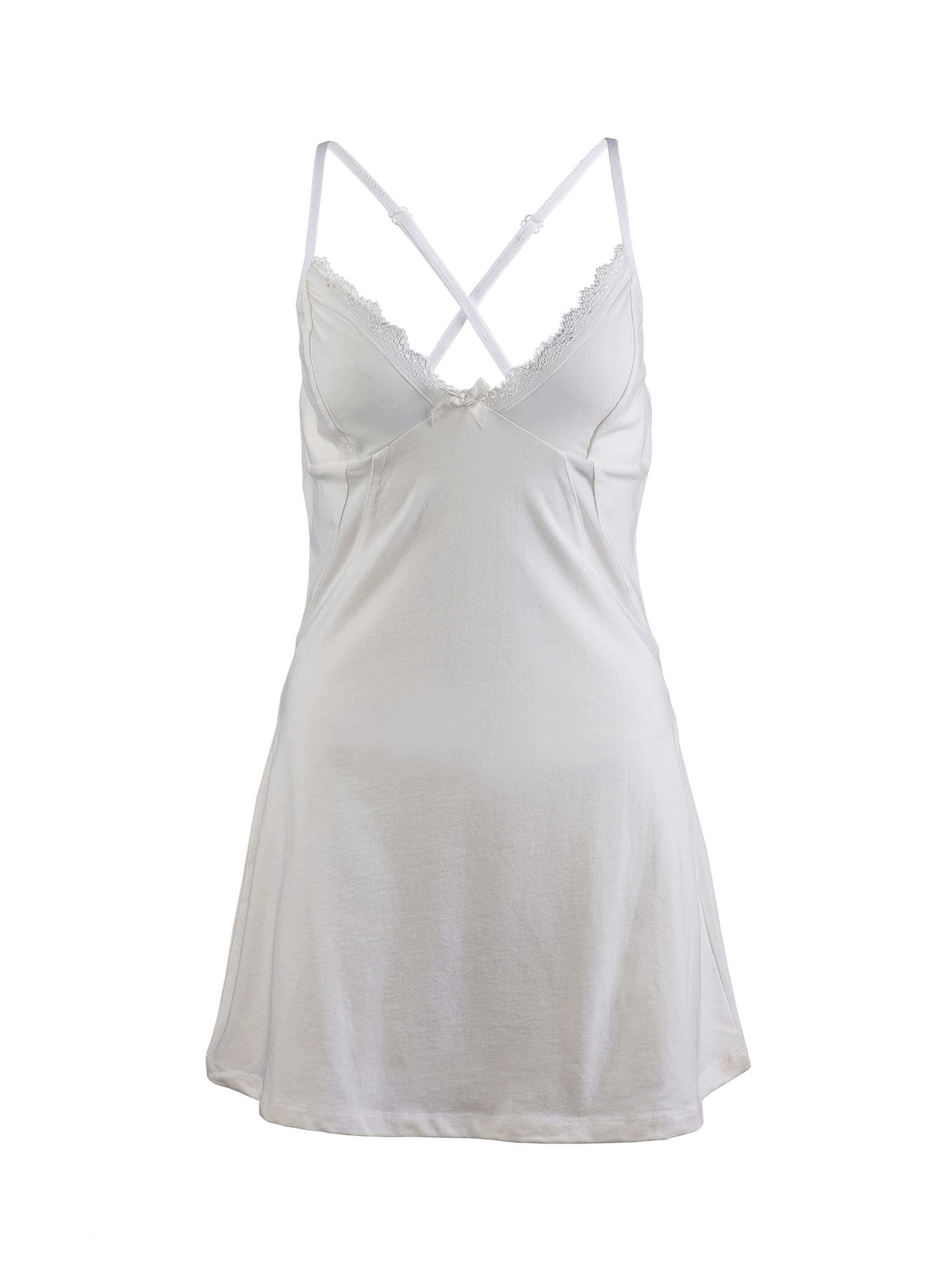 Off White mid-thigh, fitted through chemise with adjustable straps that cross over at the back for a perfect fit. The perfect nightwear dress that is kind to the skin with breathable cotton fabric and chic tulle, lace details, comfortable stretchy fabric that delicately wraps around your body.