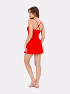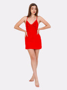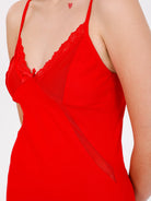 Red mid-thigh, fitted through chemise with adjustable straps that cross over at the back for a perfect fit. The perfect nightwear dress that is kind to the skin with breathable cotton fabric and chic tulle, lace details, comfortable stretchy fabric that delicately wraps around your body.