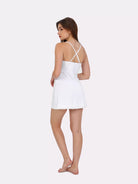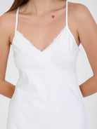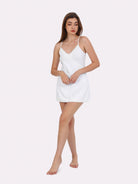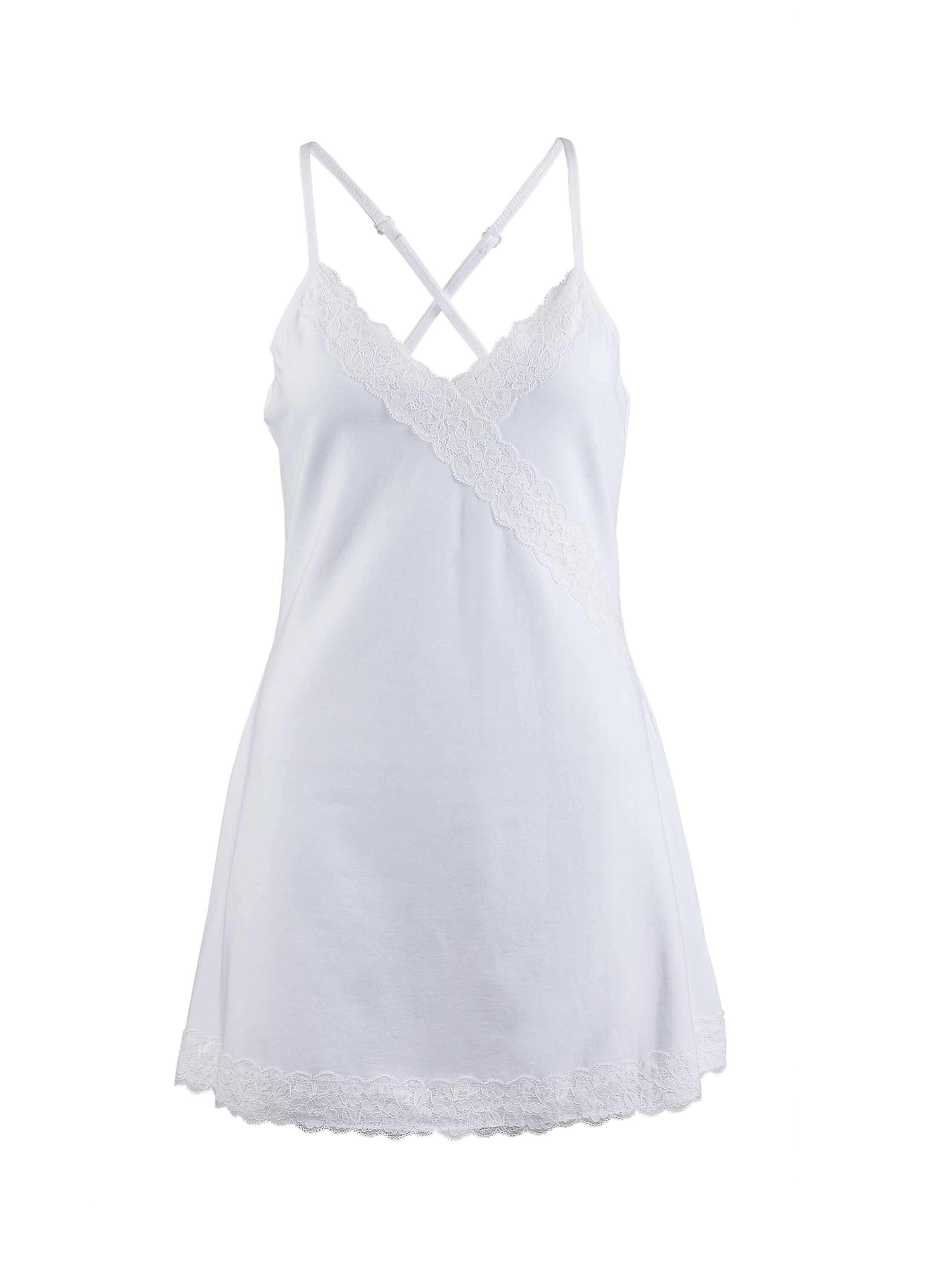 White slightly loose fit, mid-thigh, adjustable strap chemise in a breathable cotton fabric that is comfortable on your skin with delicate lace trim details around neckline and hem adding extra length. Our cute and comfy nightwear dress will be your wardrobes staple piece.