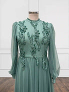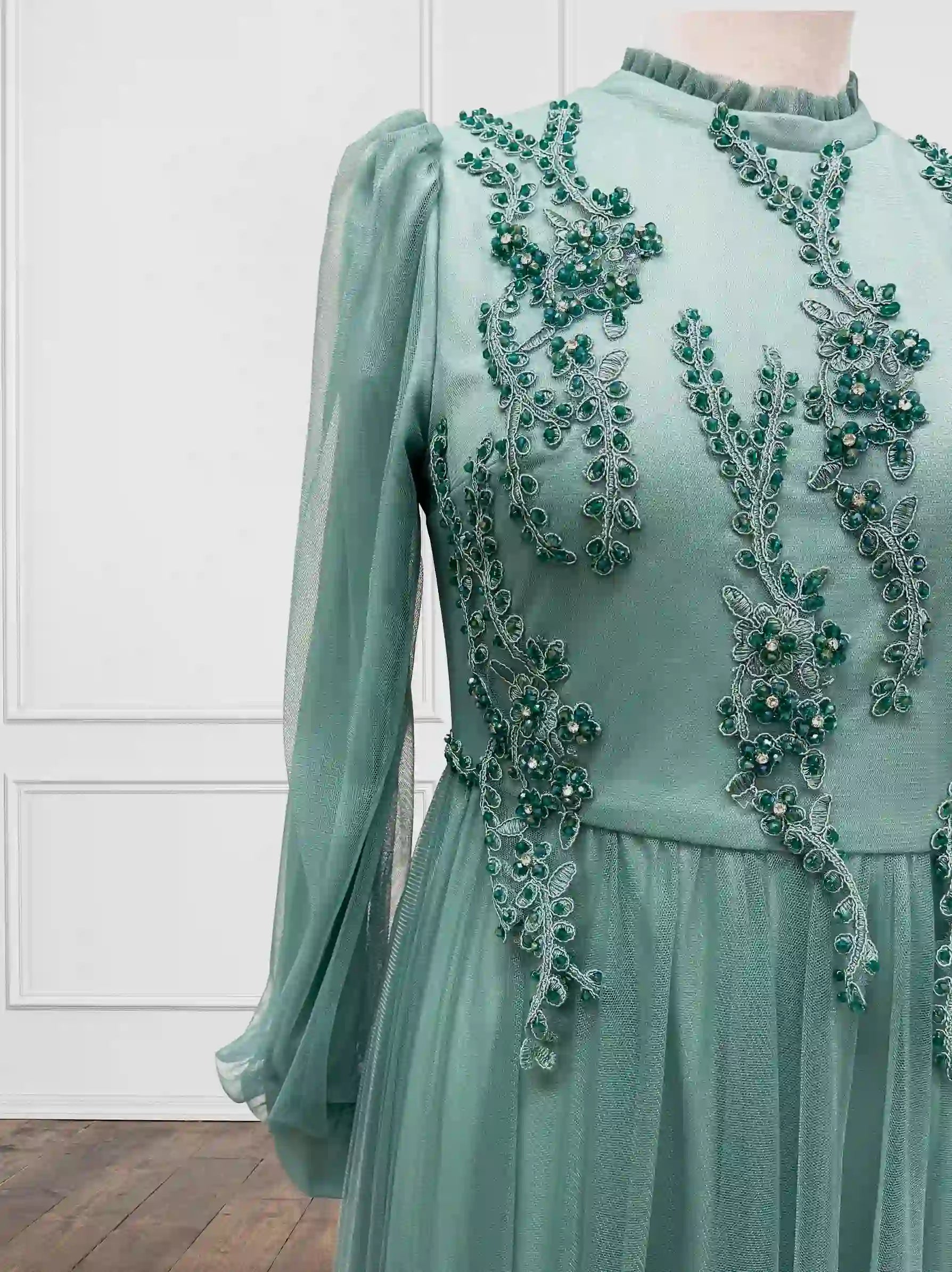 This embellished chest mint green evening dress is the perfect evening outfit. Featuring a rounded neckline with frill detail for a flattering silhouette and the bead embellishment combined with embroidery which adds more elegant touch. The floaty tulle skirt and long sleeves give this dress plenty of volume, while the fitted-waist detail flatters your figure. Perfect for any special occasion, team it with high heels and statement clutch.