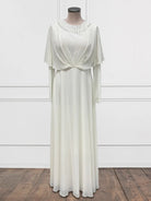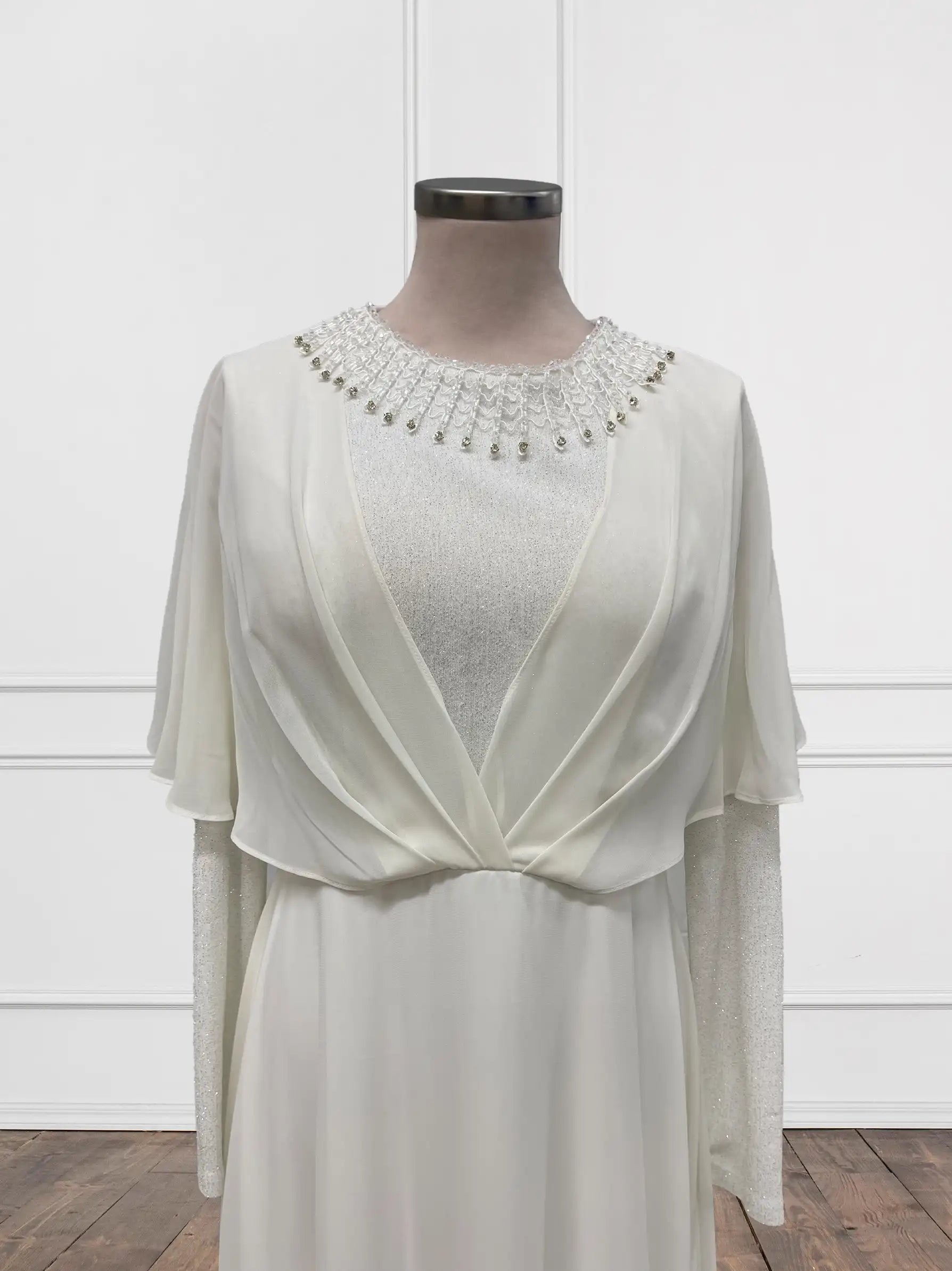 Our white modest evening dress is the perfect addition to your occasion wardrobe. Floaty dress crafted from lightweight stretch fabric designed with an ambellished neckline, long sleeves and a subtle glittery finish. An additional layer of tulle creates a dreamy silhouette that looks beautiful when in motion. Pair with ankle-strap heels for a night out or with ballet flats for an informal evening.