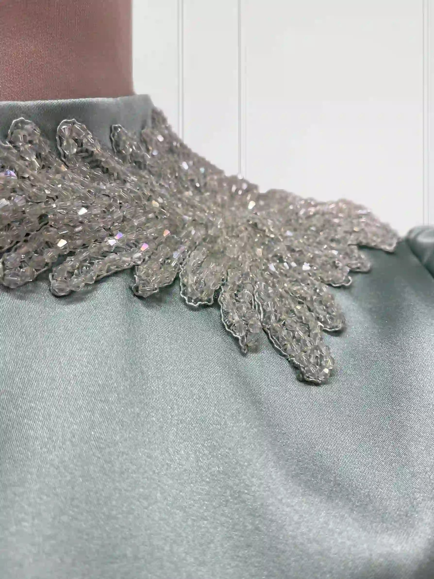 Our embellished mint green evening dress is sure to turn heads. The classic and timeless silhouette is enhanced by the exquisite beaded embellishment across the waist and beading at the neckline. Crafted from a luxurious satin fabric, ensuring beautiful movement and shape. The flattering puffed shoulder straight sleeves and fitted waist add the perfect finishing touches to this divine dress. Perfect for any occasion, the sage green embellishment satin occasion dress will make you feel elegant and stylish.