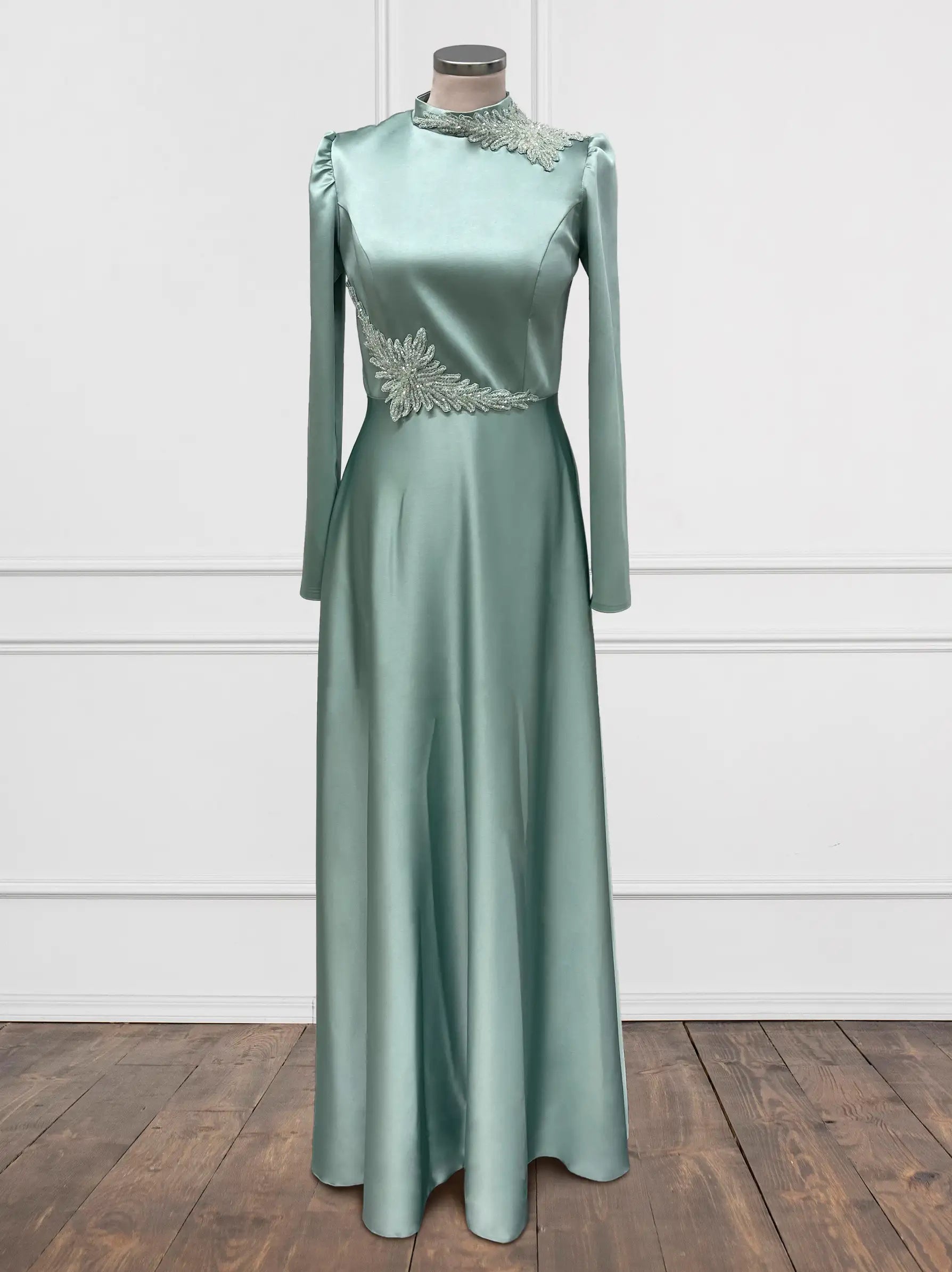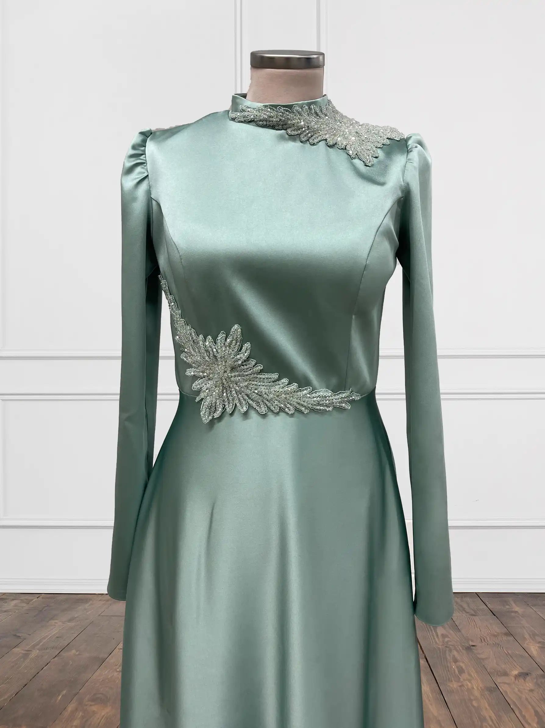 Embellished Waist And Shoulder Satin Mint Green Evening Dress