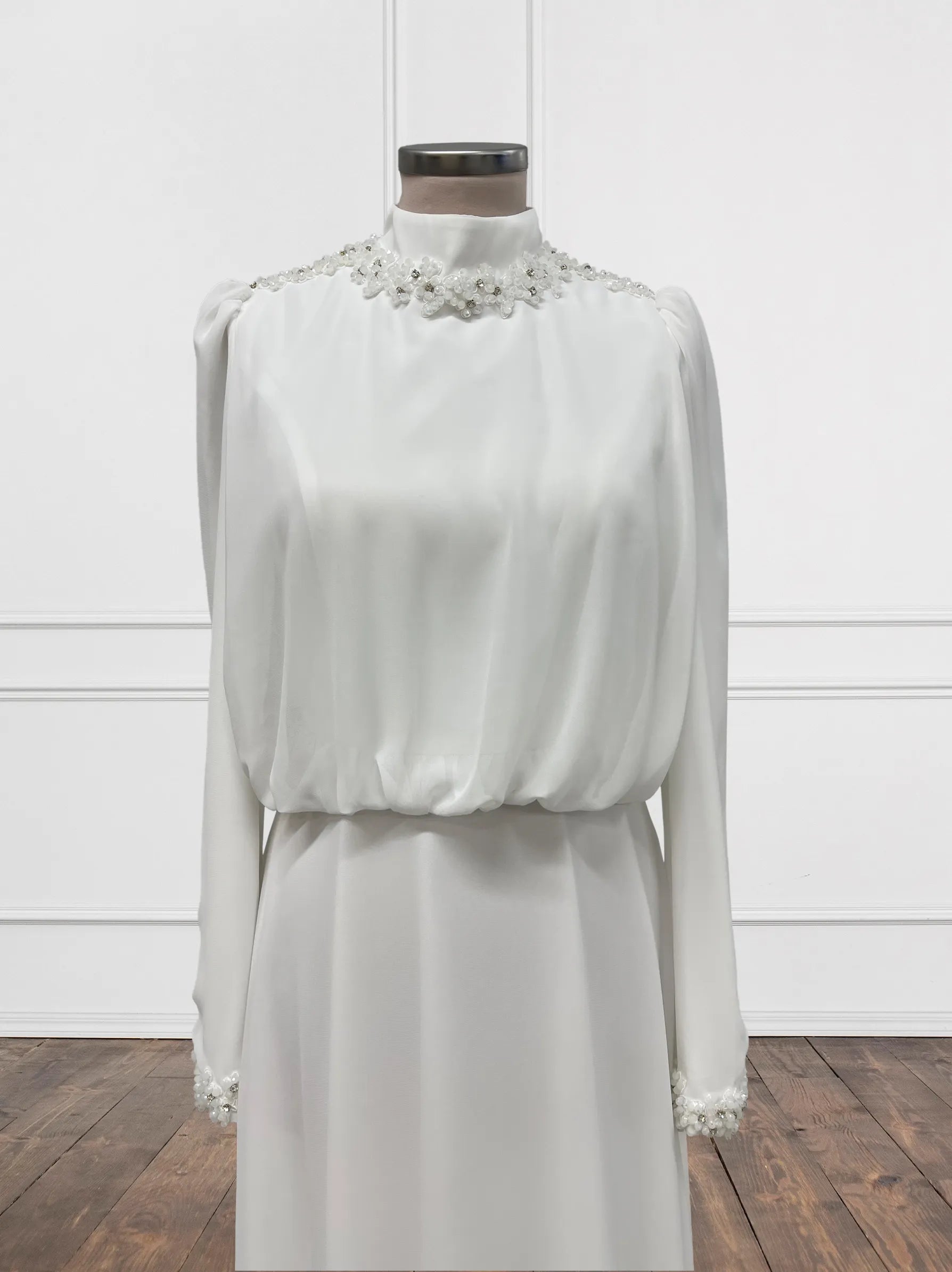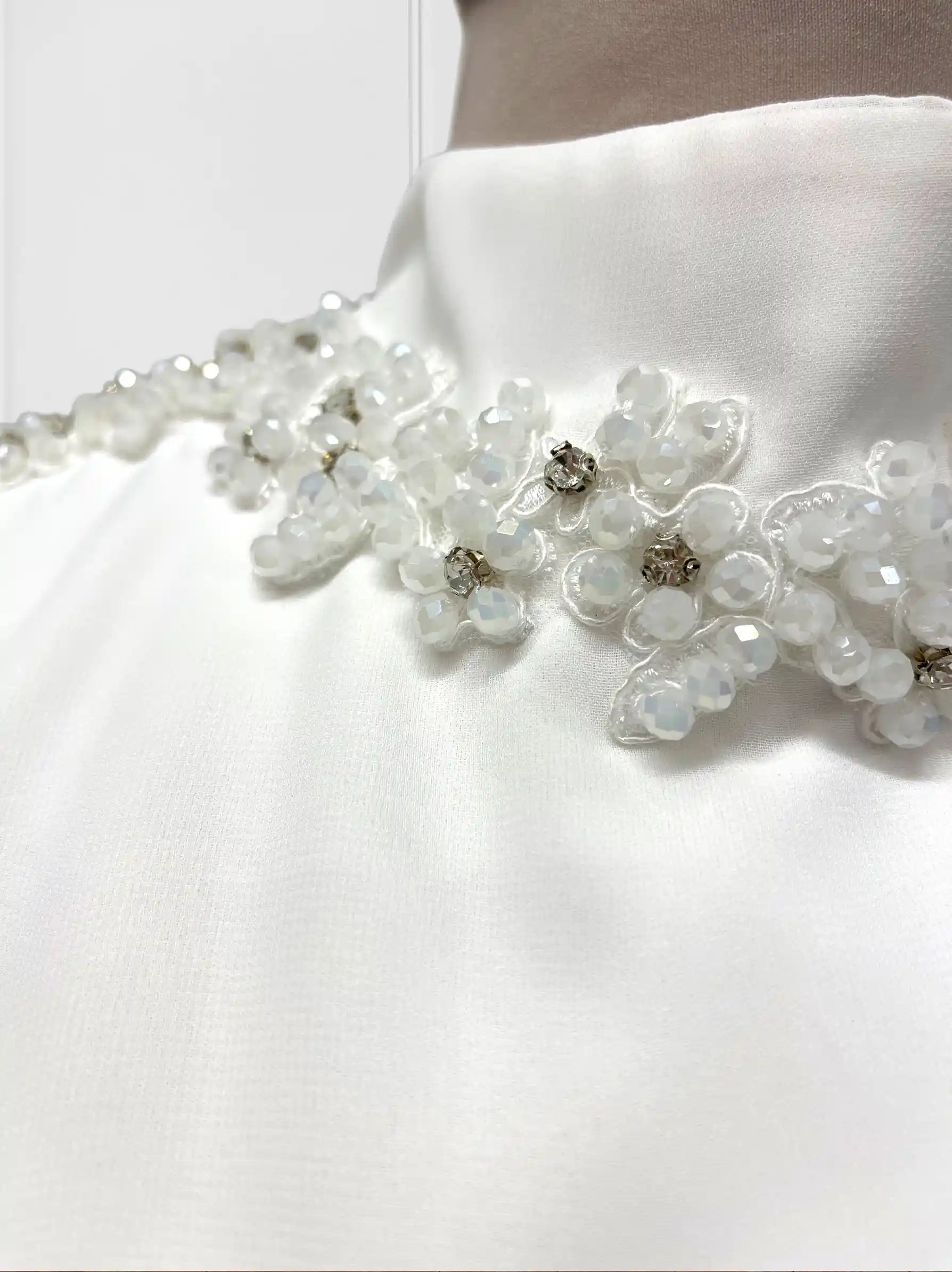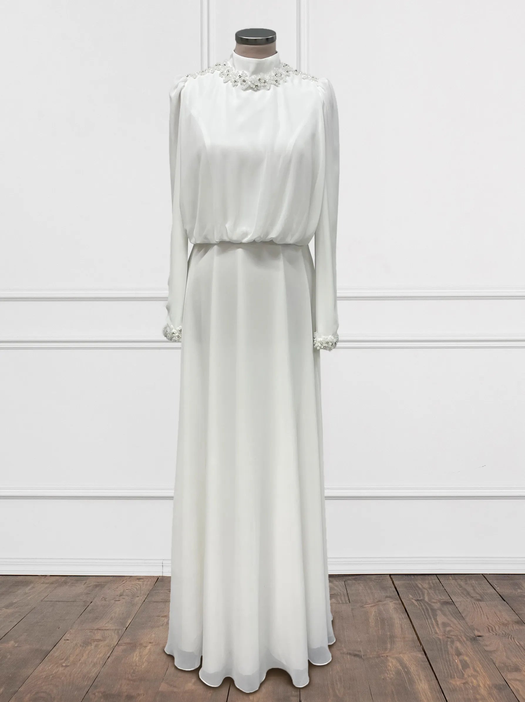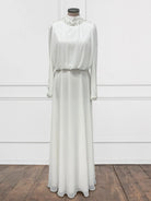 White Bead Embellished Tulle White Modest Evening Maxi Dress