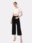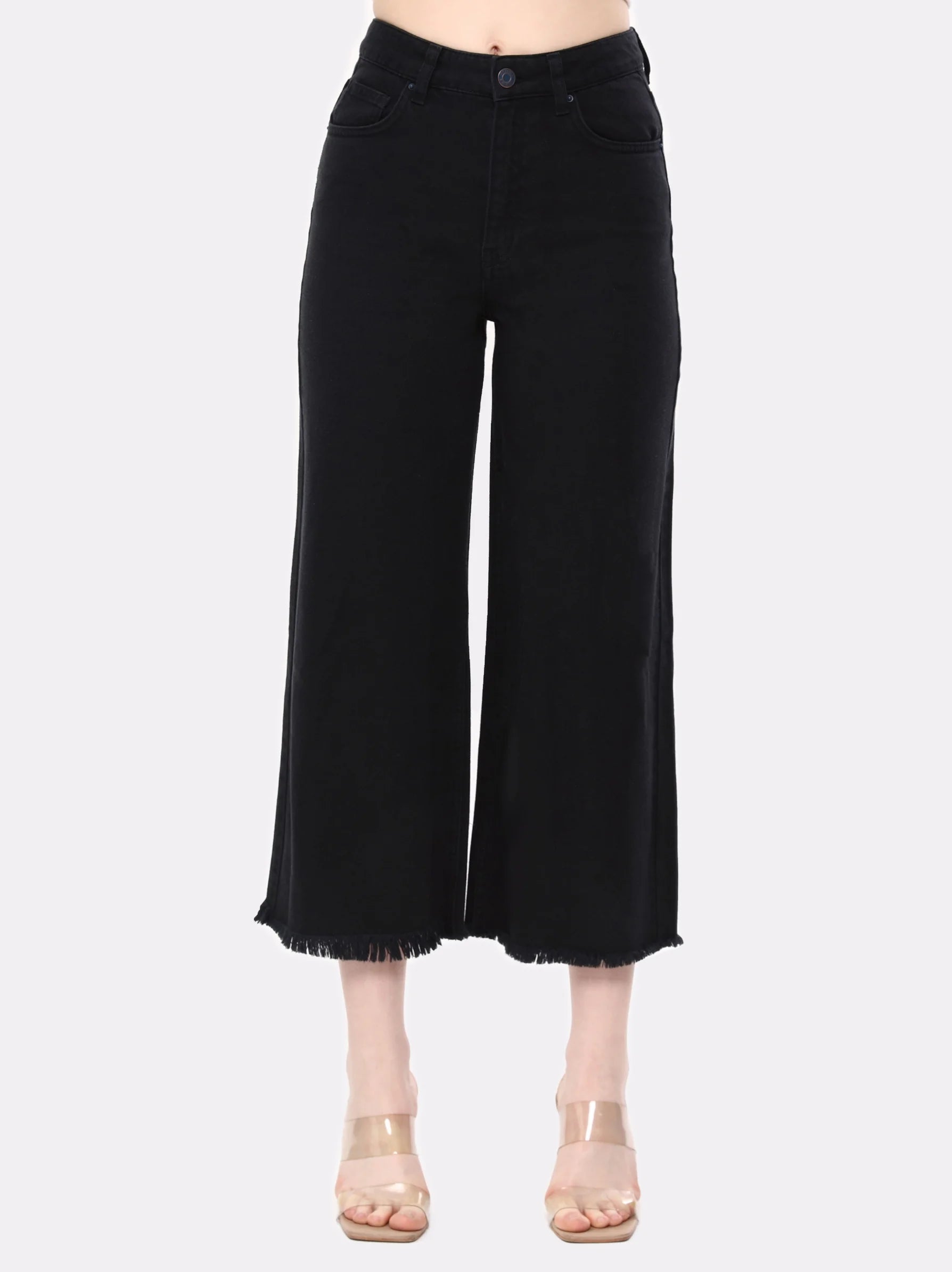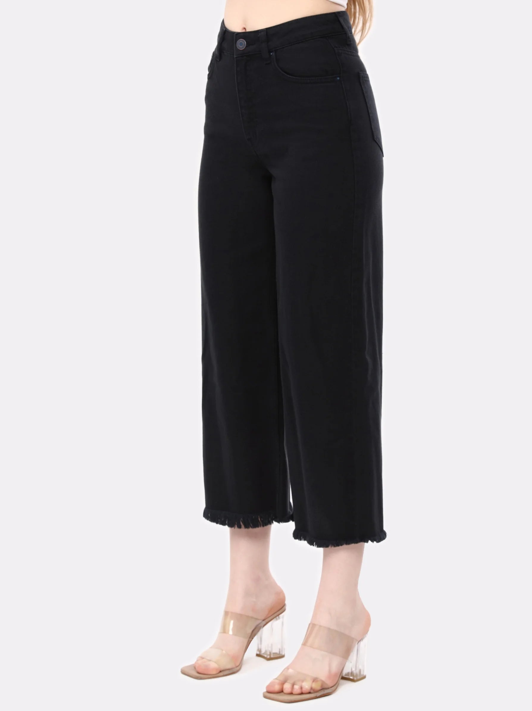 A five-pocket, ankle length jeans designed with a high waist and fitted darts at back waist to increase comfort and mobility. This versatile model made from 100% cotton and styled in a wide leg and fringed hem, is fit for all occasions. Pair it with a t-shirt and sneakers or a chic blouse and heels.
