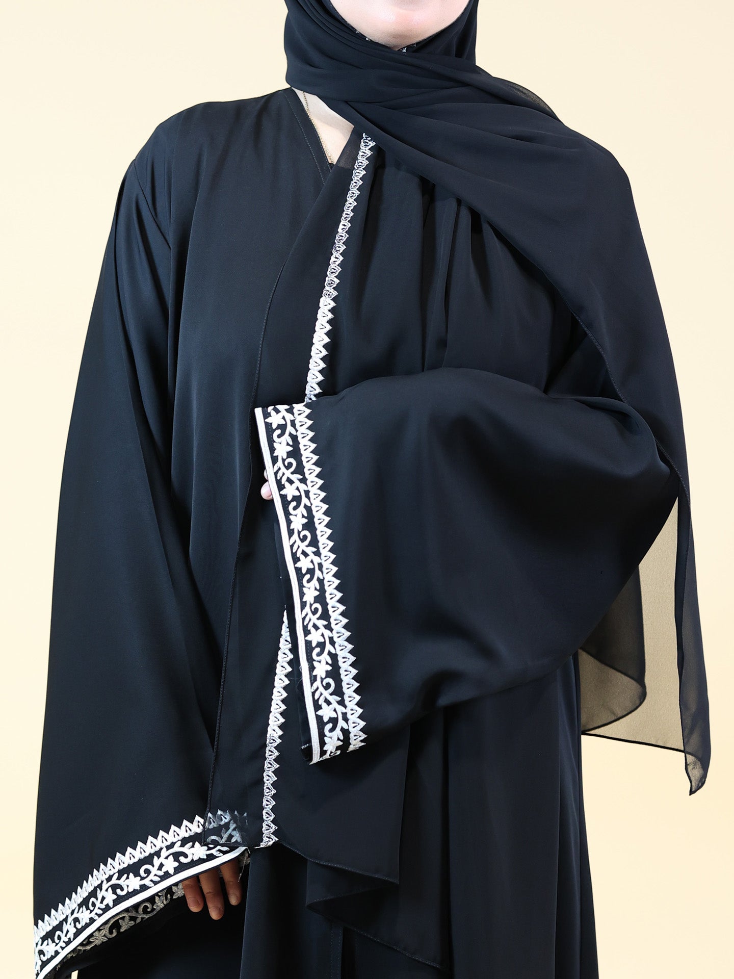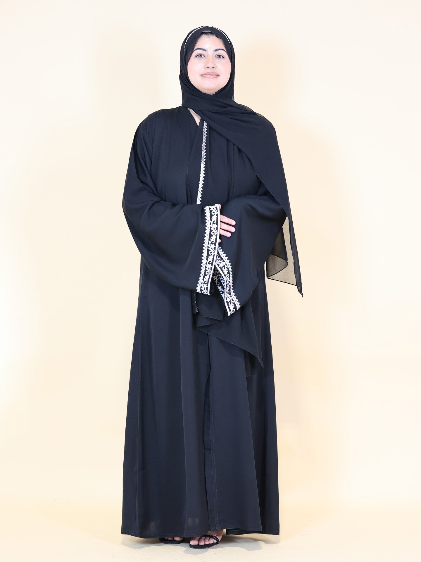 Abaya – A timeless black abaya featuring intricate white embroidery along the front opening and beautifully designed bell sleeves for a graceful and stylish touch. The flowing silhouette enhances movement and elegance.