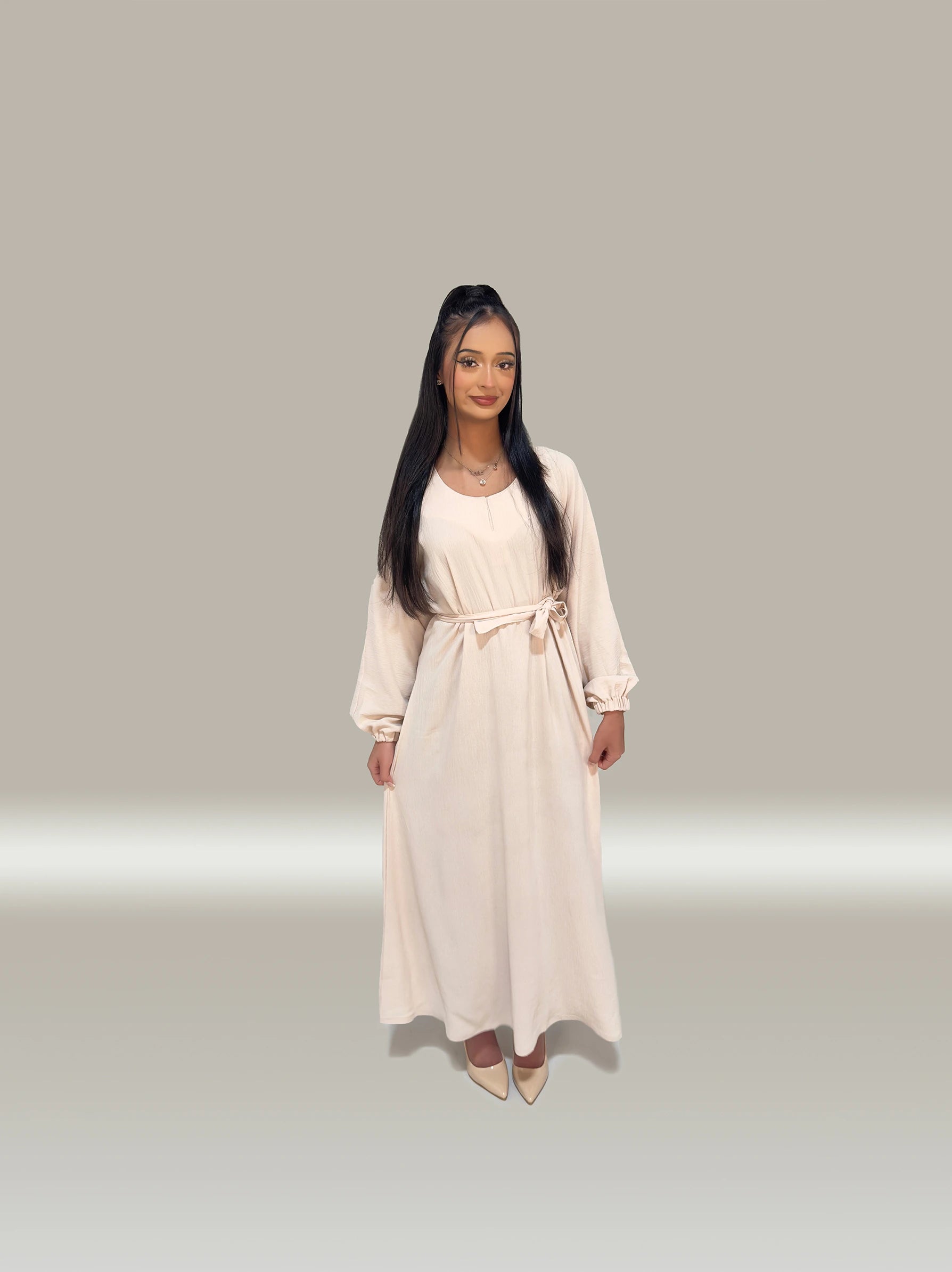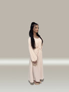 The classic nude maxi abaya meticulously crafted with precision and attention to detail, this stunning Piece exudes sophistication and grace, making it a timeless addition to your modest wardrobe.