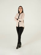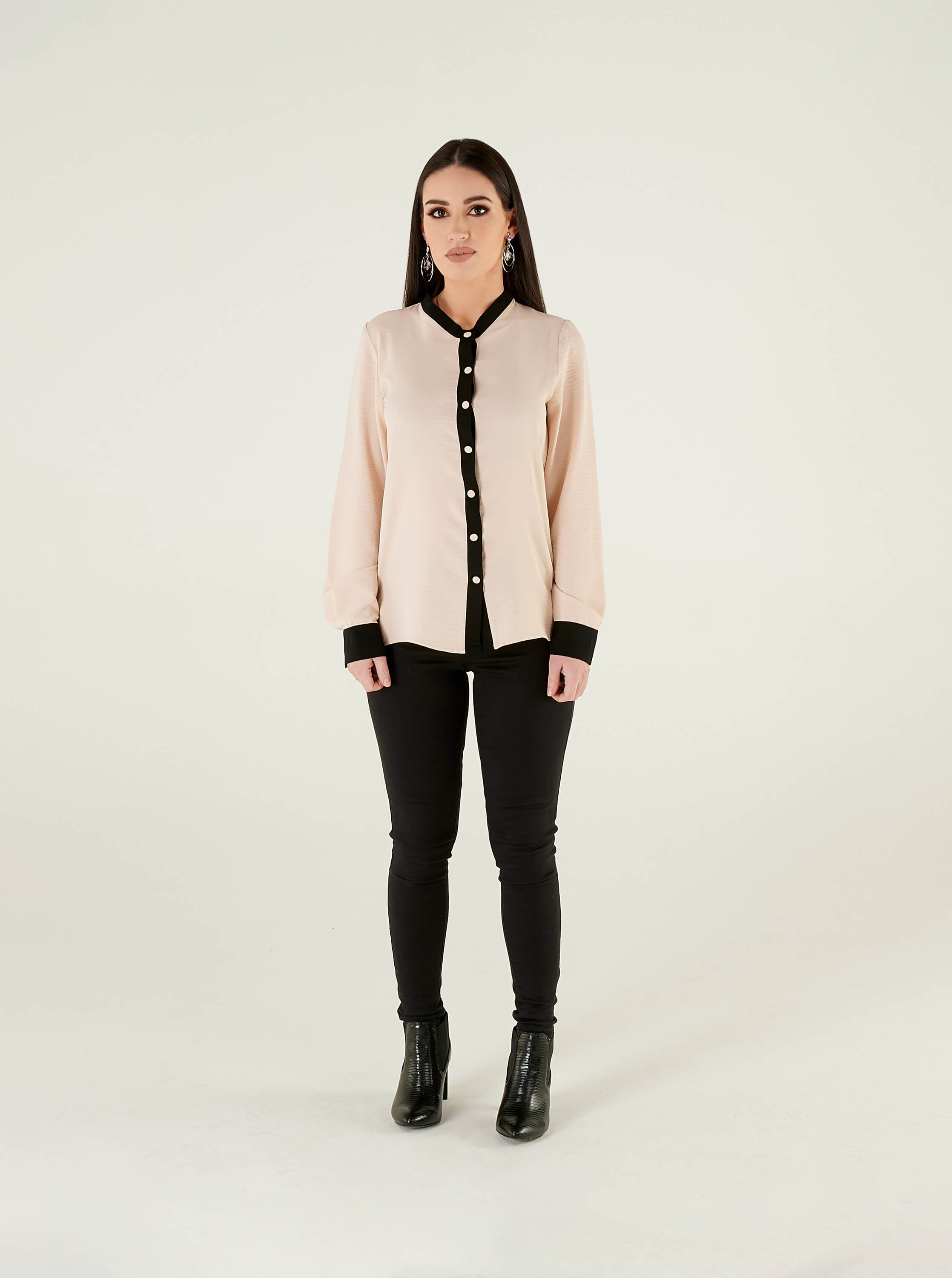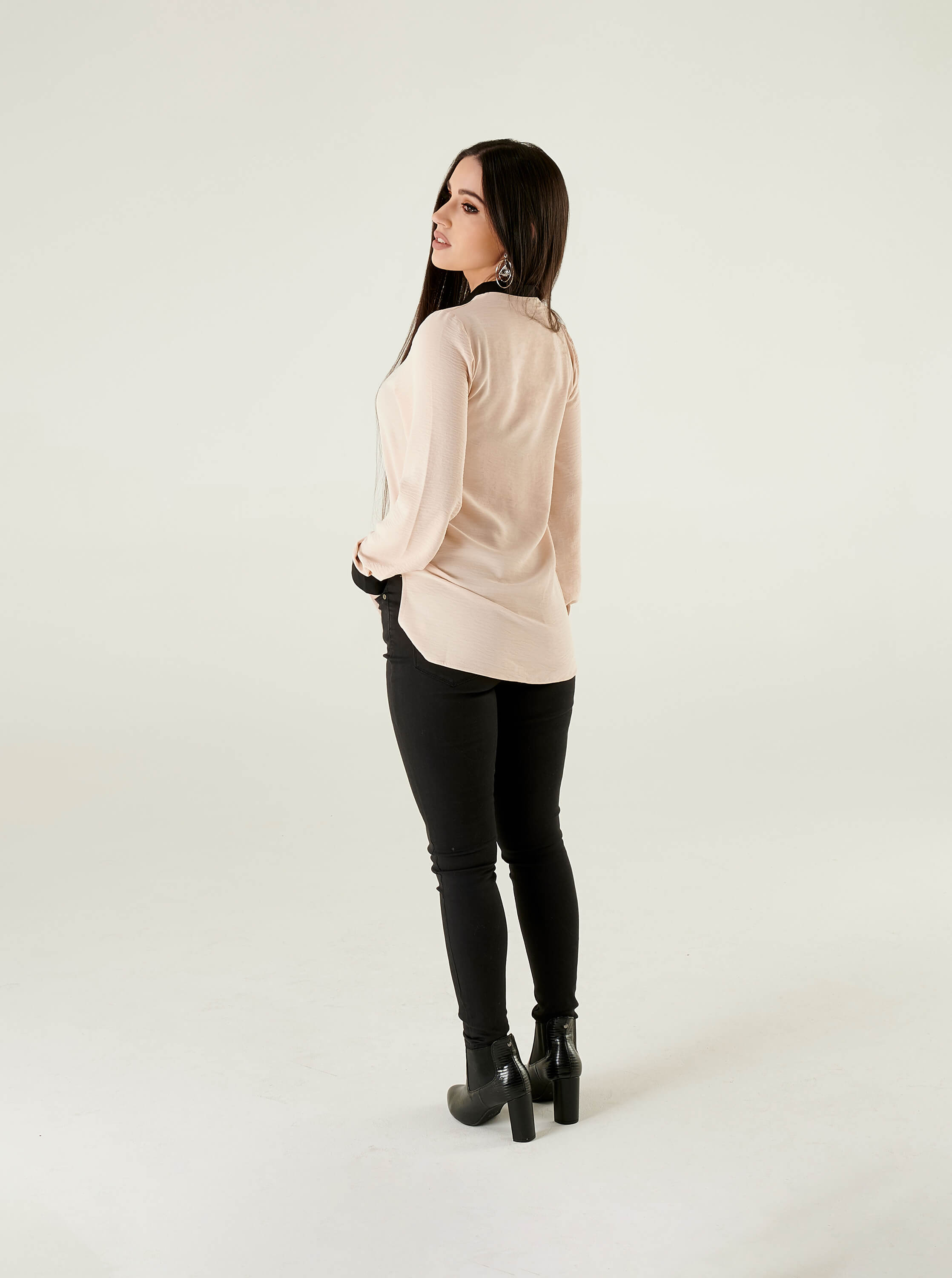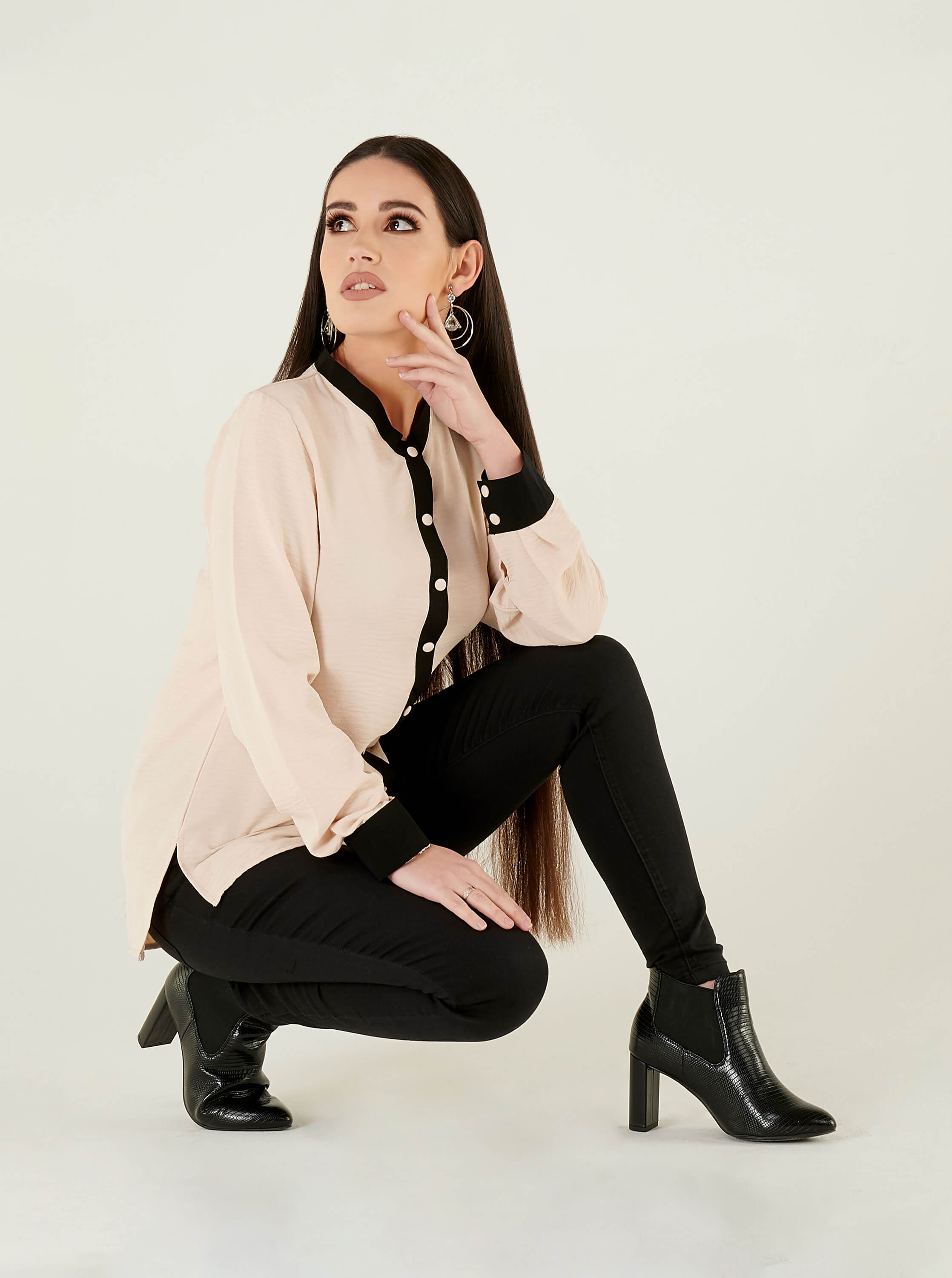 An ecru semi-fitted long sleeve, v neck shirt detailed with contrast colour block and front buttons. This piece you can effortlessly combine for both casual and formal occasions. Wear this item with black trousers, boots and our lovely selection of kimonos, for an outfit that takes you from desk to dinner.