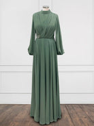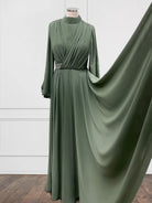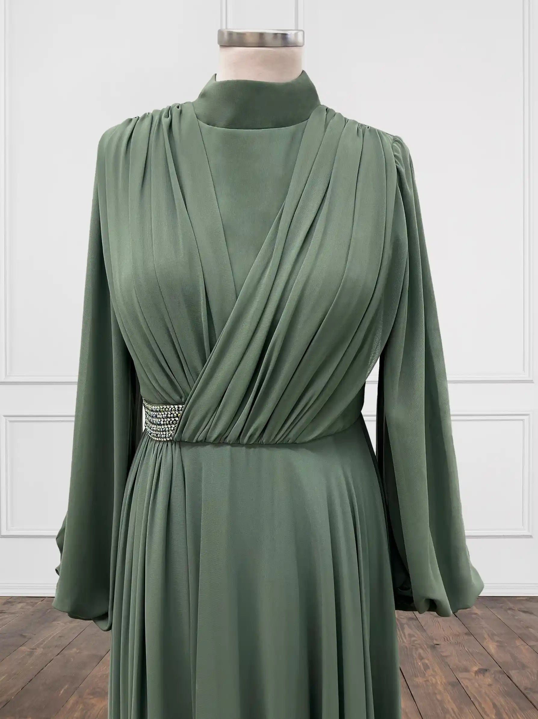 Our stylish khaki green evening dress is a perfect choice for any special occasion. It features a subtle stone belt detail along the side that adds a touch of femininity to the classic khaki color. The full long sleeves and flowing silhouette provide you with a timeless look that is sure to make heads turn. Soft to the touch and comfortable to wear, this dress is ideal for any special events. You’ll have all eyes on you in this enchanting khaki green night dress.