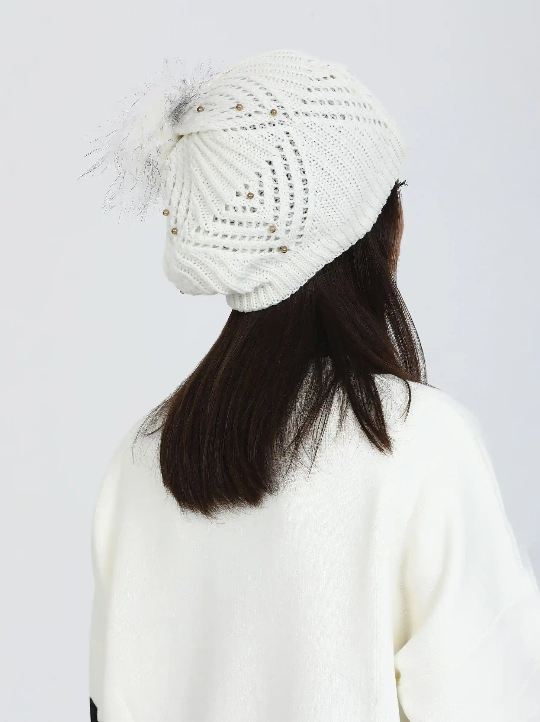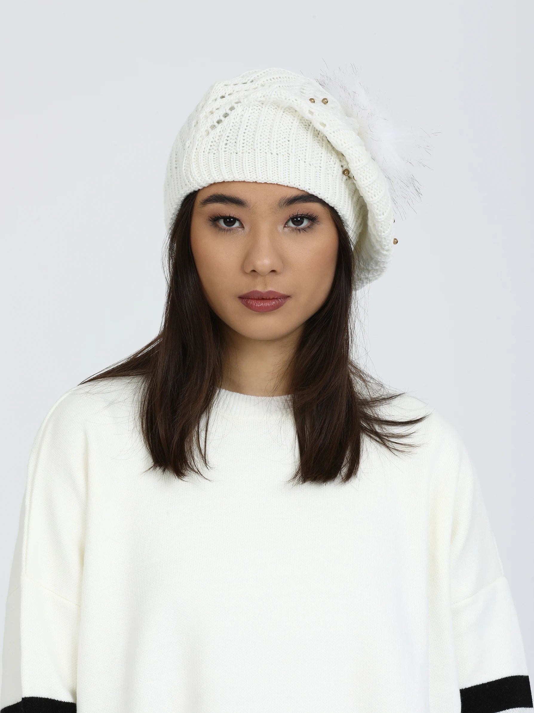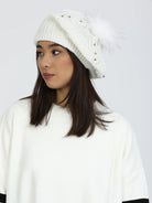 Discover the perfect finishing touch for any outfit this winter. Stay warm and trendy with this musthave winter essential. This bead embellished off white pom beret hat, can go with anything and everything in your closet while keeping your head warm and fashionable.
